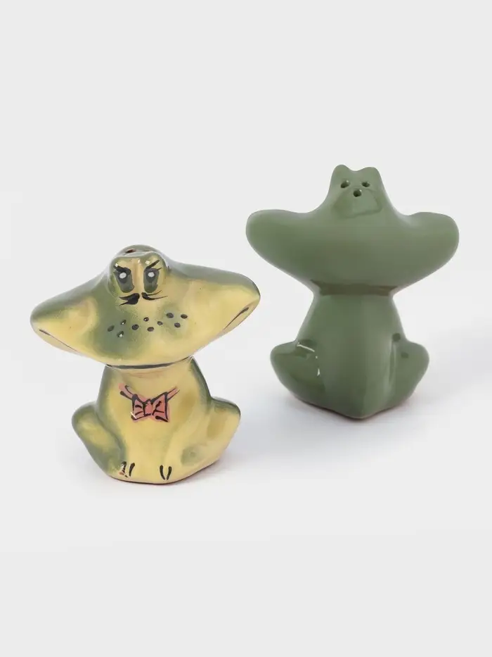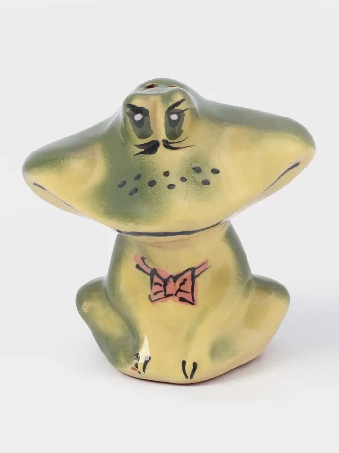 Этот набор керамических аксессуаров для специй сочетает игривый дизайн с практичностью кухонной организации. Две фигурные ёмкости в виде лягушек на общей подставке создают единую композицию для соли и перца. Зелёный цвет и ручная роспись создают природную тематику, превращая функциональный предмет в элемент декора.