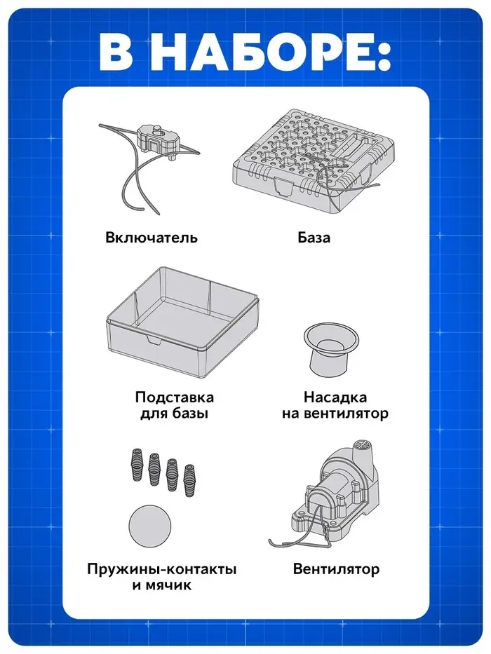 В комплекте есть всё необходимое , чтобы мощным потоком воздуха заставить мячик летать: