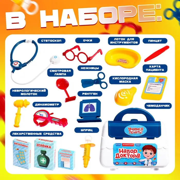 - Набор включает в себя 15 предметов из арсенала доктора.