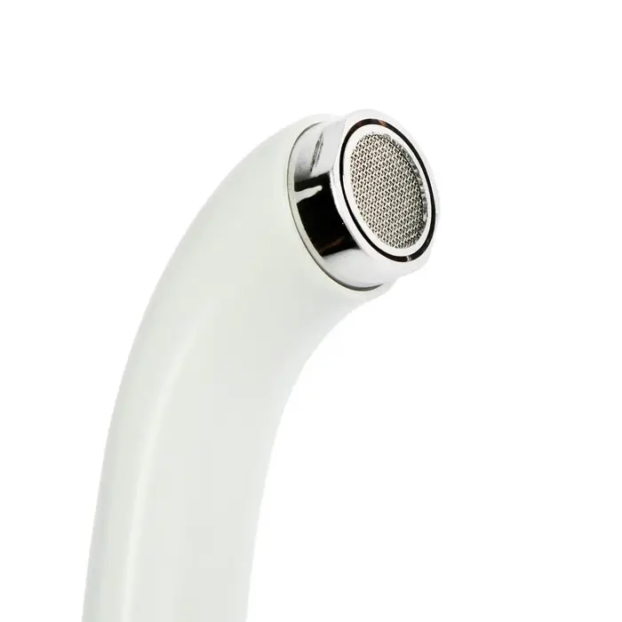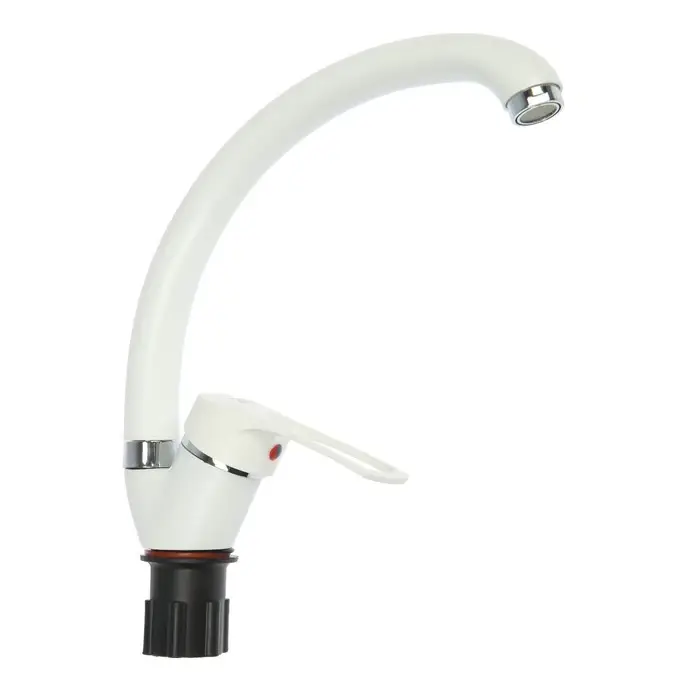 Бело-хромированный смеситель с изливом «Утка» — рычажная модель с высоким изогнутым изливом. Корпус из цинкового сплава для установки на раковину или столешницу.