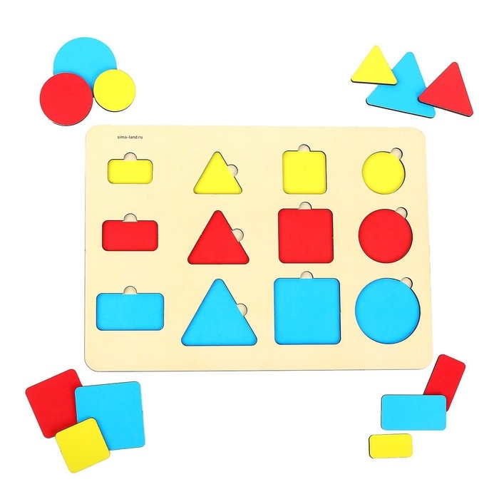 - Для большей продуктивности занимайтесь вместе с ребёнком, расскажите о каждой фигуре, какого она цвета и размера, чем она отличается от других.