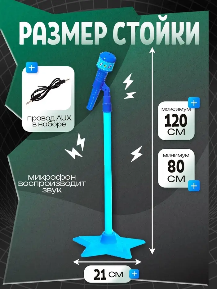 - Высота стойки микрофона регулируется, это даёт возможность подстраивать её под рост малыша. Максимальная высота — 120 см, минимальная — 80 см. Микрофон усиливает звук.