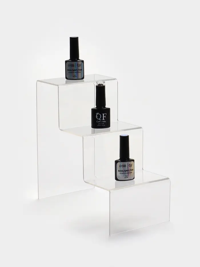 - Функциональность: три ступеньки создают удобную многоуровневую платформу для демонстрации разнообразных предметов — от косметики до сувениров.