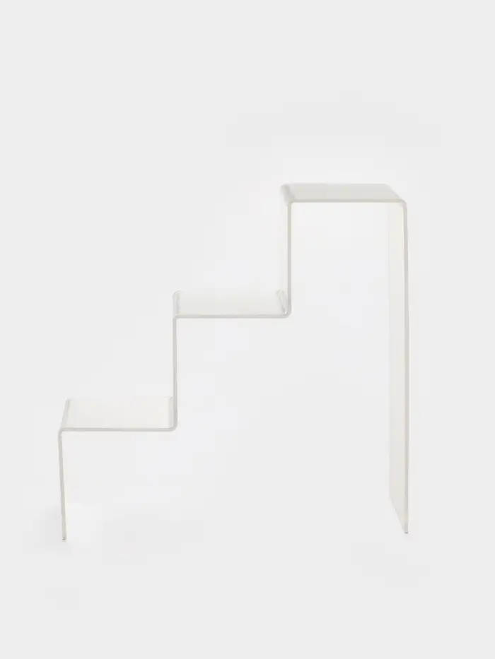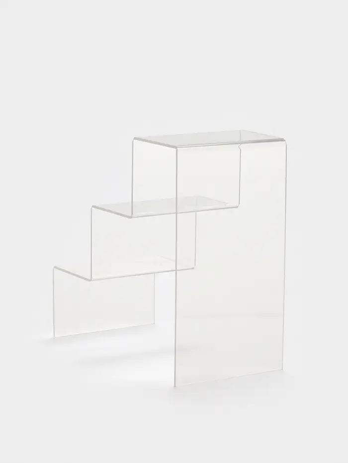 Каждая из трёх ступенек высотой 7 см и глубиной 7 см обеспечивает удобное расположение объектов на разной высоте, создавая эффект многослойной экспозиции. Прозрачный материал не отвлекает от демонстрируемых изделий, а наоборот подчёркивает их, добавляя лёгкости и современности в оформление.