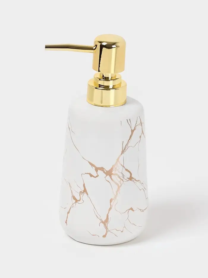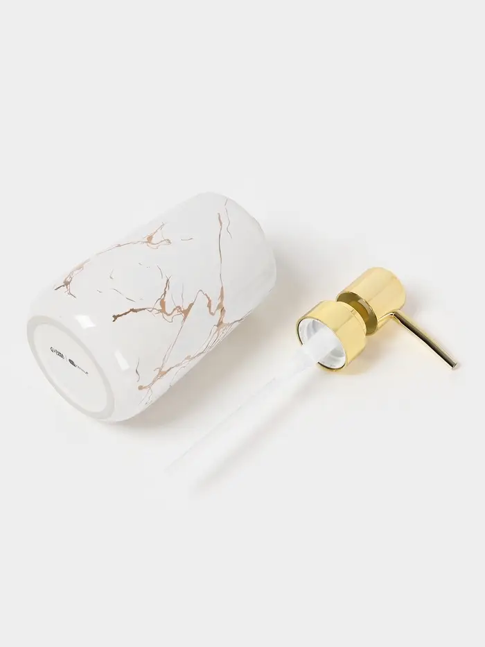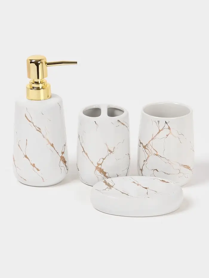Этот набор состоит из четырёх предметов: мыльницы, дозатора для мыла объемом 400 мл и двух стаканов. Каждый элемент выполнен из высококачественной керамики, обеспечивающей долговечность и стойкость к царапинам и перепадам температуры.