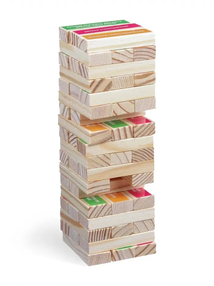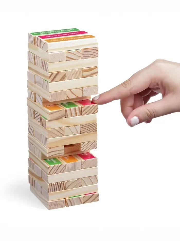 Побеждает тот, кто последним вытянул брусок перед тем, как башня развалилась!