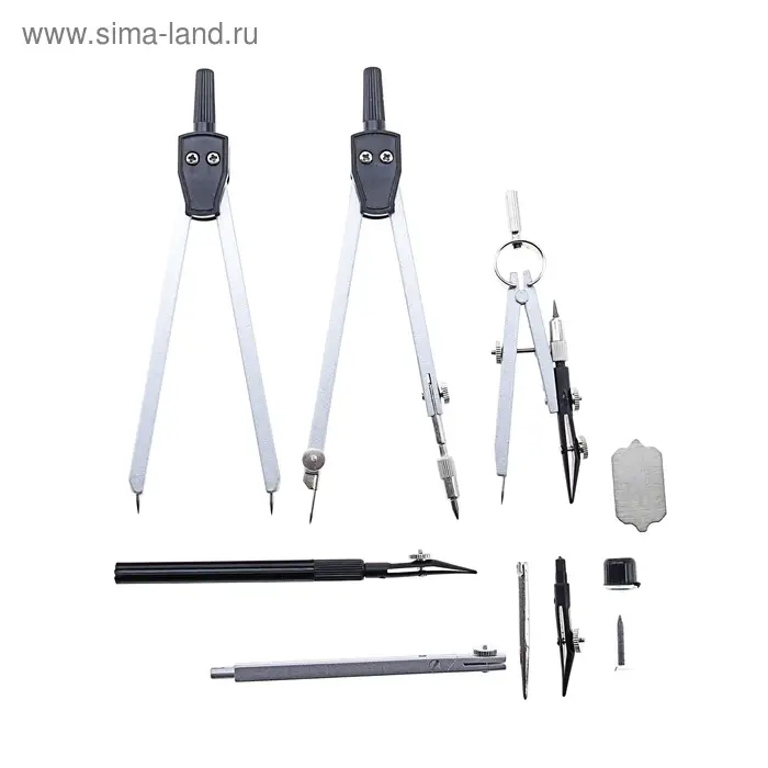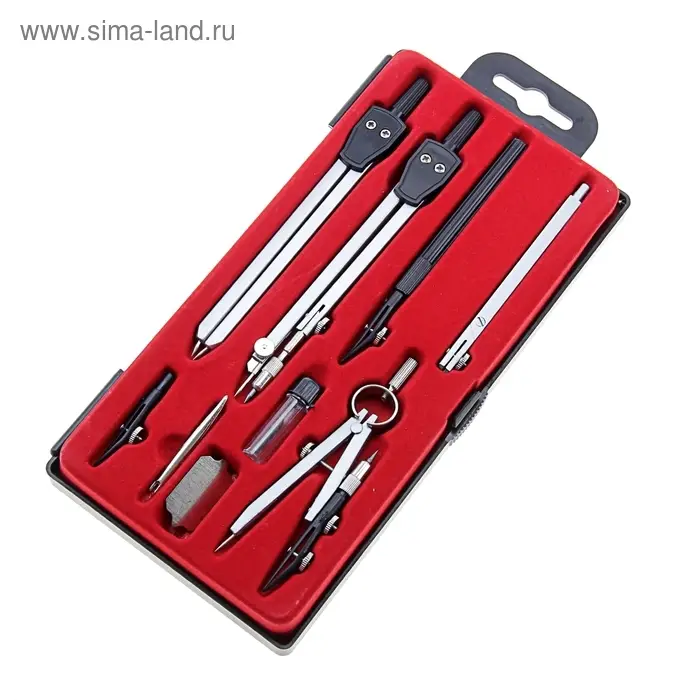 - Набор состоит из девяти предметов: трёх металлических циркулей (два по 150 мм и один 105 мм), двух рейсфедеров, двух удлинителей, центрика, отвёртки и грифелей.