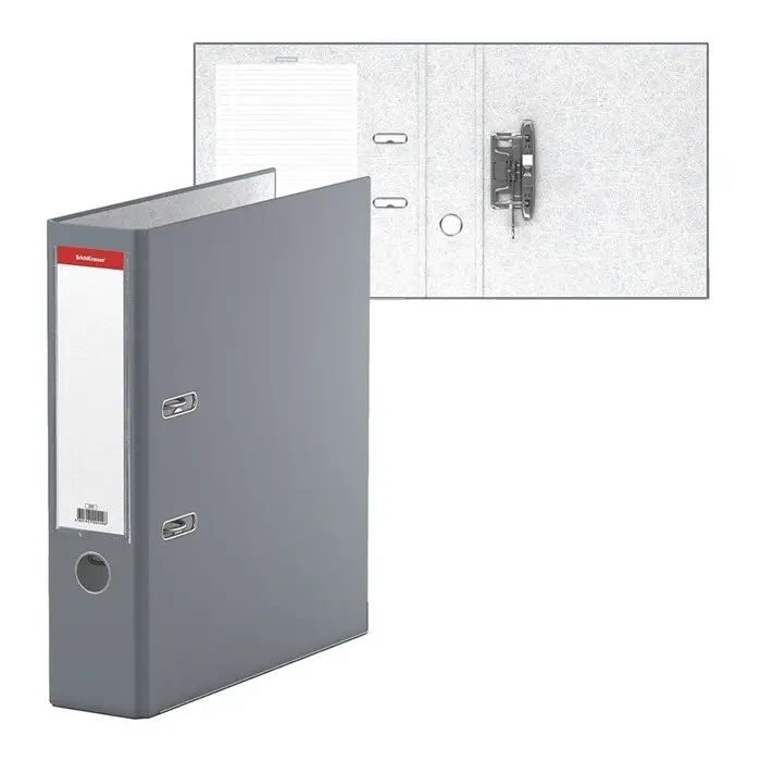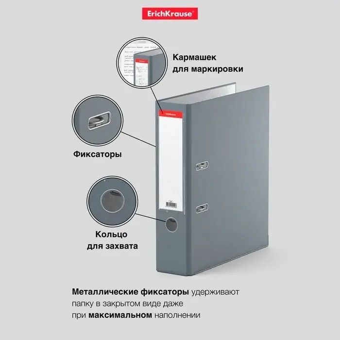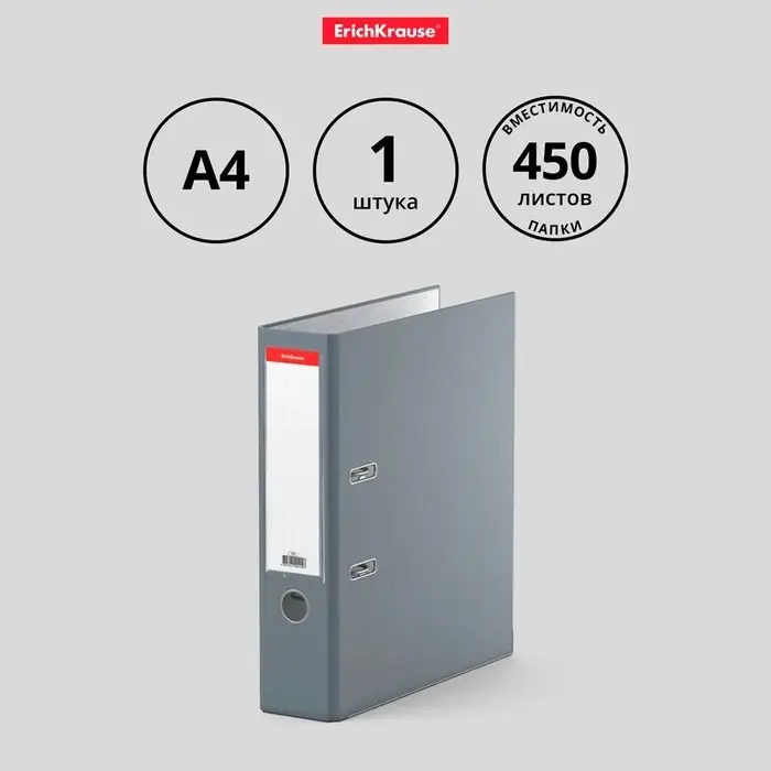 Папка-регистратор А4, 70 мм, ErichKrause «Бизнес», собранный, серый, пластиковый карман, металлический кант, картон 2 мм, вместимость 450 листов