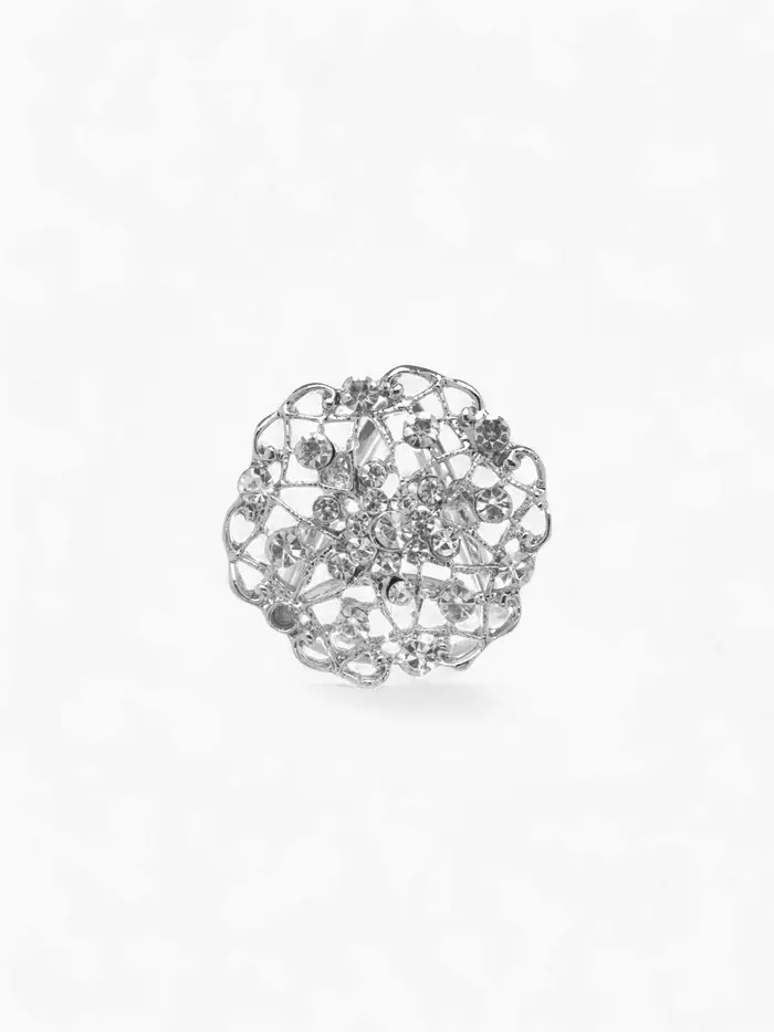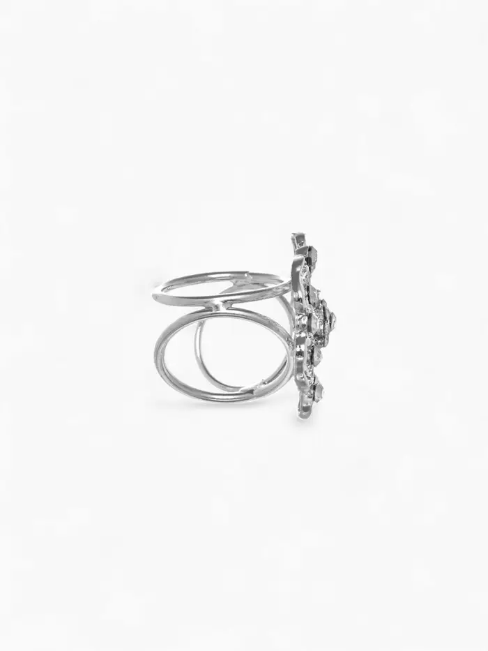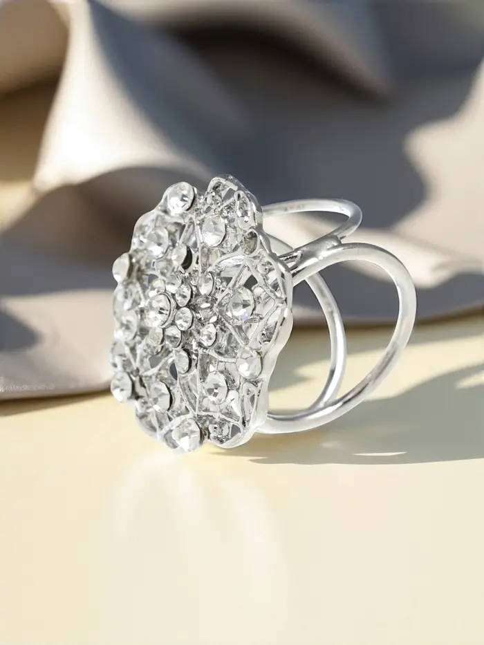 - Изысканный дизайн: Ажурная форма с серебряной фурнитурой и стразами добавляет нотку роскоши, делая кольцо не только практичным, но и эффектным элементом вашего наряда.
