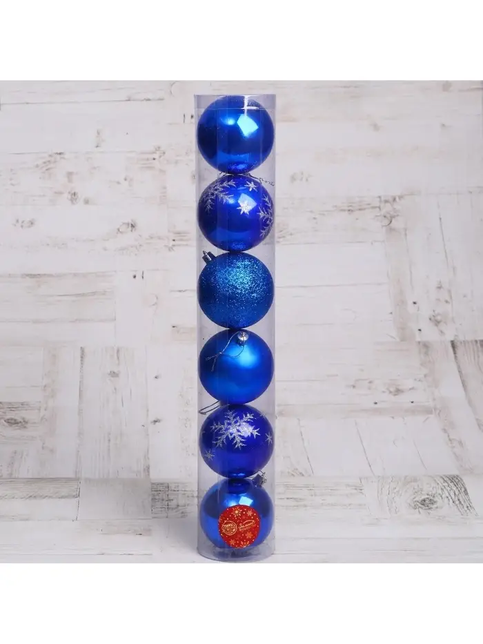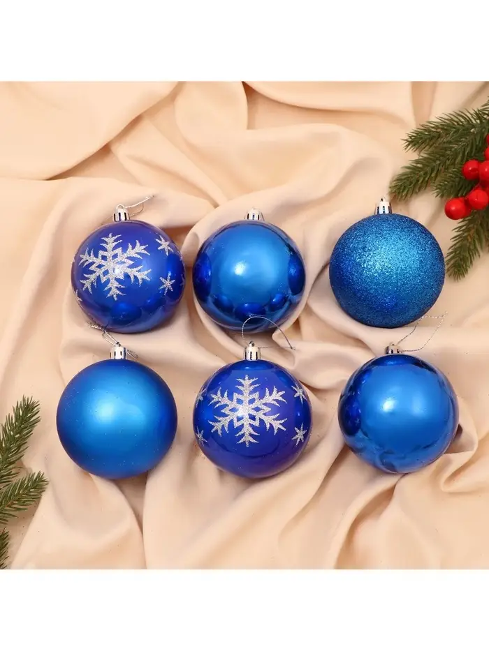Новогодние шары «Снежинка капель» — это яркий и мягкий набор для украшения ёлки в синей гамме. В комплекте 6 пластиковых игрушек диаметром 8 см с рисунком, выполненных в форме шара и оформленных в стиле фьюжн. Это решение для тех, кто хочет добавить празднику света, формы и зимней атмосферы без лишней пестроты.