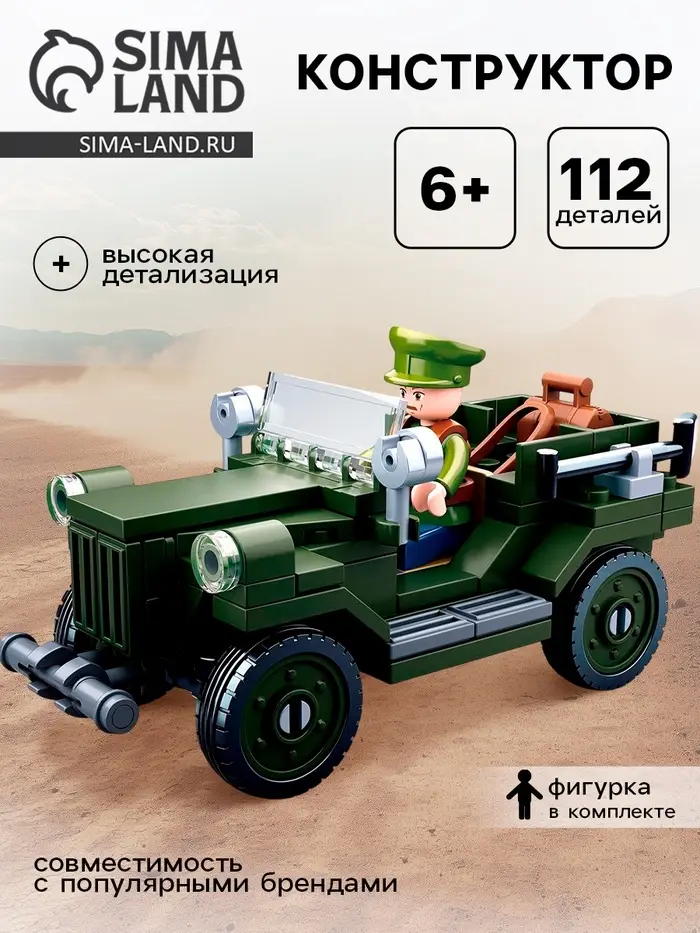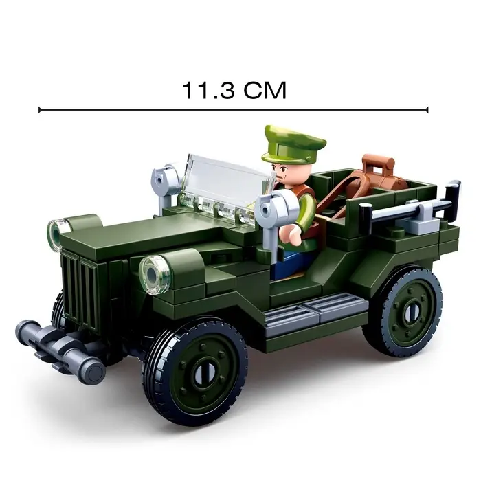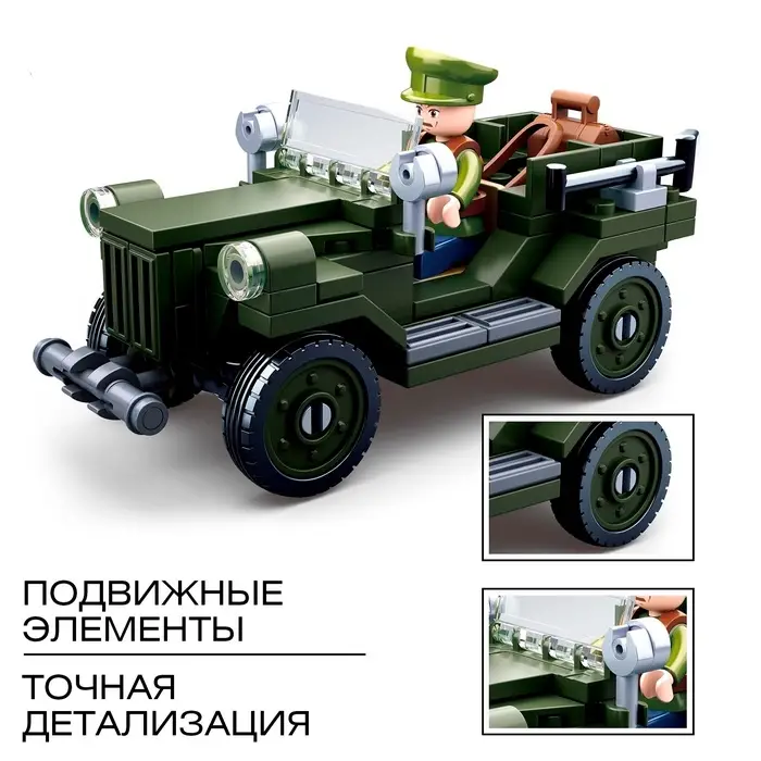 - 112 деталей для сборки реалистичного военного джипа.