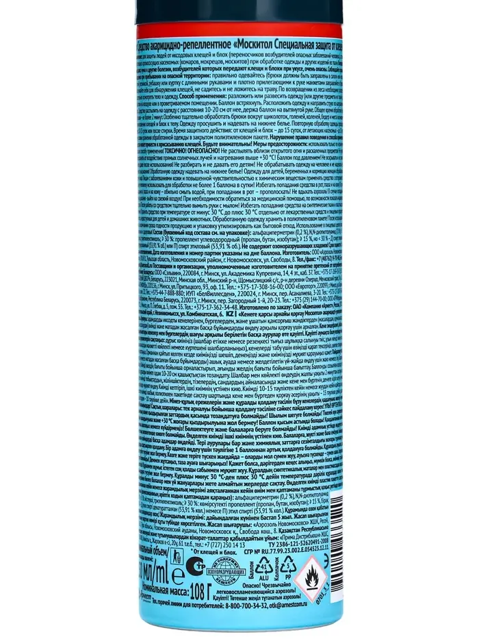 Описание: защитное средство от клещей.Способ применения: разложить или развесить одежду (или другие предметы из ткани) для обработки на воздухе или в проветриваемом помещении. Баллон встряхнуть. Расположить одежду и направить струю по направлению ветра. Средство распылить на одежду с расстояния 10 – 20 см от нее, держа баллон на вытянутой руке. Общее время обработки брюк и рубашки не более 2 минут. Особенно тщательно обработать брюки вокруг щиколоток, голеней, коленей, бедер и места возможного проникновения клещей и блох к телу. Одежду просушить и надевать на нижнее белье. Повторную обработку одежды проводить через 10 - 15 суток или после стирки. Время защитного действия от клещей и блох до 15 суток, от летающих насекомых – до 10 суток при условии хранения обработанной одежды в закрытом полиэтиленовом пакете. Нарушение правил поведения и способа применения средства может привести к присасыванию клещей. Будьте внимательны.Меры предосторожности: использовать только по назначению согласно способу применения! Токсично! Огнеопасно! Не распылять вблизи открытого огня и раскаленных предметов. Не курить! Предохранять от воздействия прямых солнечных лучей и нагревания выше плюс 30 ºС! Баллон под давлением! Не разбирать и не давать его детям. Не обрабатывать одежду на человеке и не надевать ее до полного высыхания. Обработанную одежду надевать на нижнее белье. Одежду для детей, беременных и кормящих женщин обрабатывают другие лица. Лицам с заболеваниями кожи и повышенной чувствительностью к химическим веществам применять средство с осторожностью. Одному человеку использовать для обработки не более 1 баллона в сутки. Избегать попадания средства в рот, глаза и на кожу. В случае попадания в глаза и на кожу – обильно смыть водой, при попадании в рот – прополоскать. Не вдыхать аэрозоль! После работы со средством тщательно вымыть руки с мылом. Избегать попадания средства на синтетические ткани и пластмассовые изделия. Хранить средство при температуре от минус 30 ºС до плюс 30 ºС, отдельно от лекарственных средств и пищевых продуктов, в местах, недоступных для детей и домашних животных. После использования или по окончании срока годности аэрозольную упаковку, не вскрывая и не сжигая, утилизируют как бытовой отход. Меры предосторожности. Баллон под давлением! Не разбирать и не давать детям! Огнеопасно! Не распылять вблизи открытого огня и раскаленных предметов. Предохранять от действия прямых солнечных лучей и нагревания выше 40 ºС. Не рекомендуется наносить на кожу детям, беременным и кормящим женщинам, а также лицам с заболеванием кожи и повышенной чувствительностью к химическим веществам. Наносить на кожу не более 3 раз в сутки. Для обработки одежды одному человеку использовать не более 1 баллона в сутки. Повторную обработку одежды проводить по мере необходимости, но не чаще чем через 3 суток. Не допускать попадания средства в рот, глаза и на поврежденные участки кожи. В случае попадания в глаза и на поврежденные участки кожи — промыть их водой, при попадании в рот — прополоскать. Избегать попадания средства на синтетические ткани и пластмассовые изделия.Хранение: хранить средство при температуре от минус 30 °С до плюс 30 °С вдали от источников огня, отдельно от лекарств и пищевых продуктов, в недоступном для детей месте.Состав: альфациперметри
