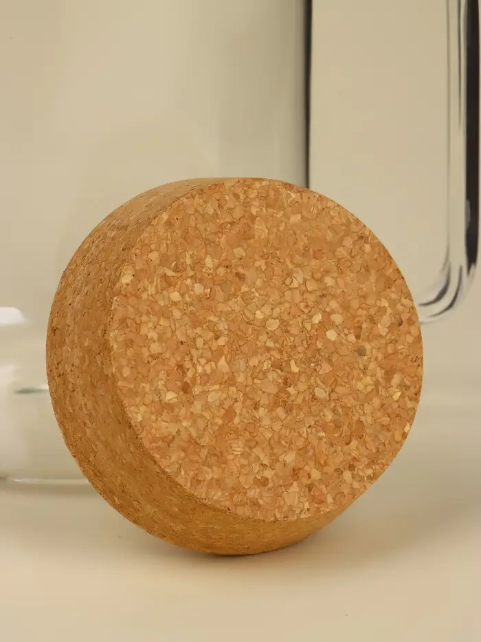 - Пробковая крышка: плотно прилегает и хорошо закрывается. Пробка приятна на ощупь, не скользит в руках и добавляет изделию природной текстуры.