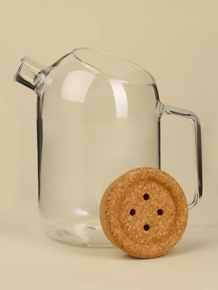 Стеклянный кувшин с пробковой крышкой — это удачное сочетание натуральных материалов и практичности. Он подходит для хранения воды, сока или компота, а также станет стильным элементом сервировки на столе.