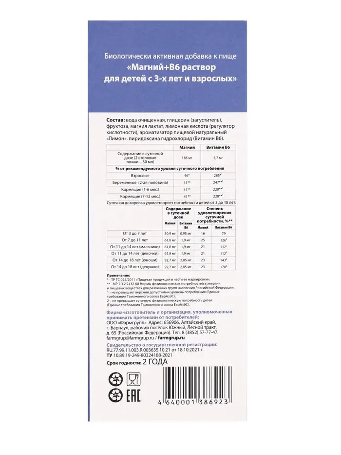 Состав: вода очищенная, глицерин (загуститель), фруктоза, магния лактат, лимонная кислота (регулятор кислотности), ароматизатор пищевой натуральный «Лимон», пиридоксина гидрохлорид (Витамин B6).