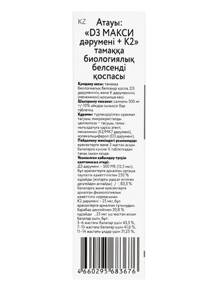 Состав: крахмал, микрокристаллическая целлюлоза, тальк, менахинон (витамин К2), холекальциферол (Витамин D3).
