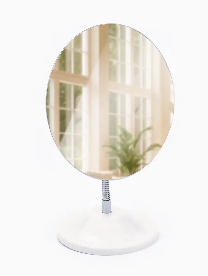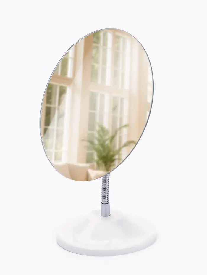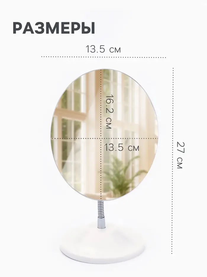 Компактное зеркало на ножке помогает организовать пространство для ухода за собой и создания образа. Благодаря отсутствию увеличения отражение остаётся естественным, что важно для повседневных процедур. Универсальный дизайн гармонирует с разными стилями интерьера, не занимая лишнего места.
