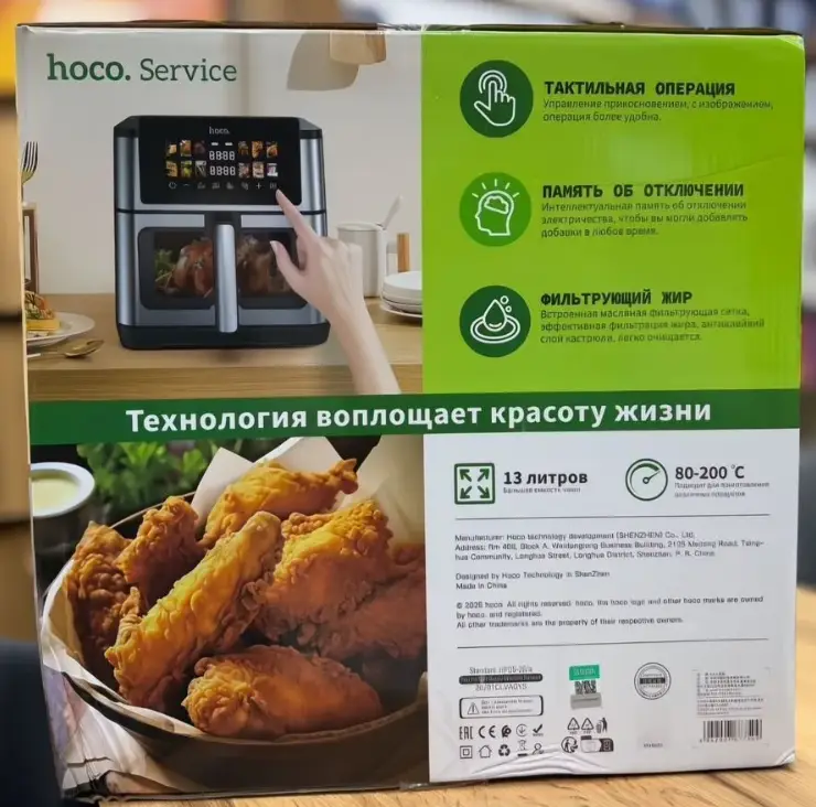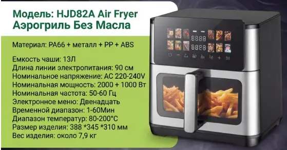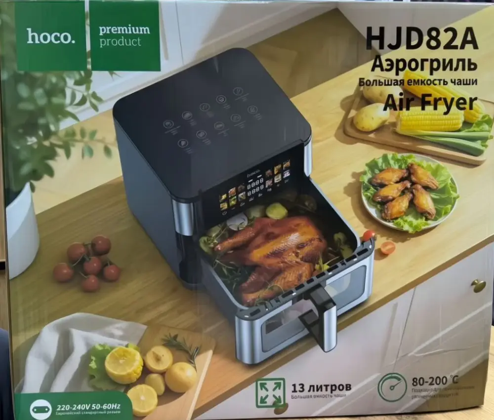 Аэрогриль HOCO HJD82A — компактный помощник для быстрой и здоровой готовки. Мощность 3000 Вт обеспечивает равномерный нагрев до 200°C, а функции аэрогриля и аэрофритюрницы позволяют запекать, жарить и обжаривать без масла.