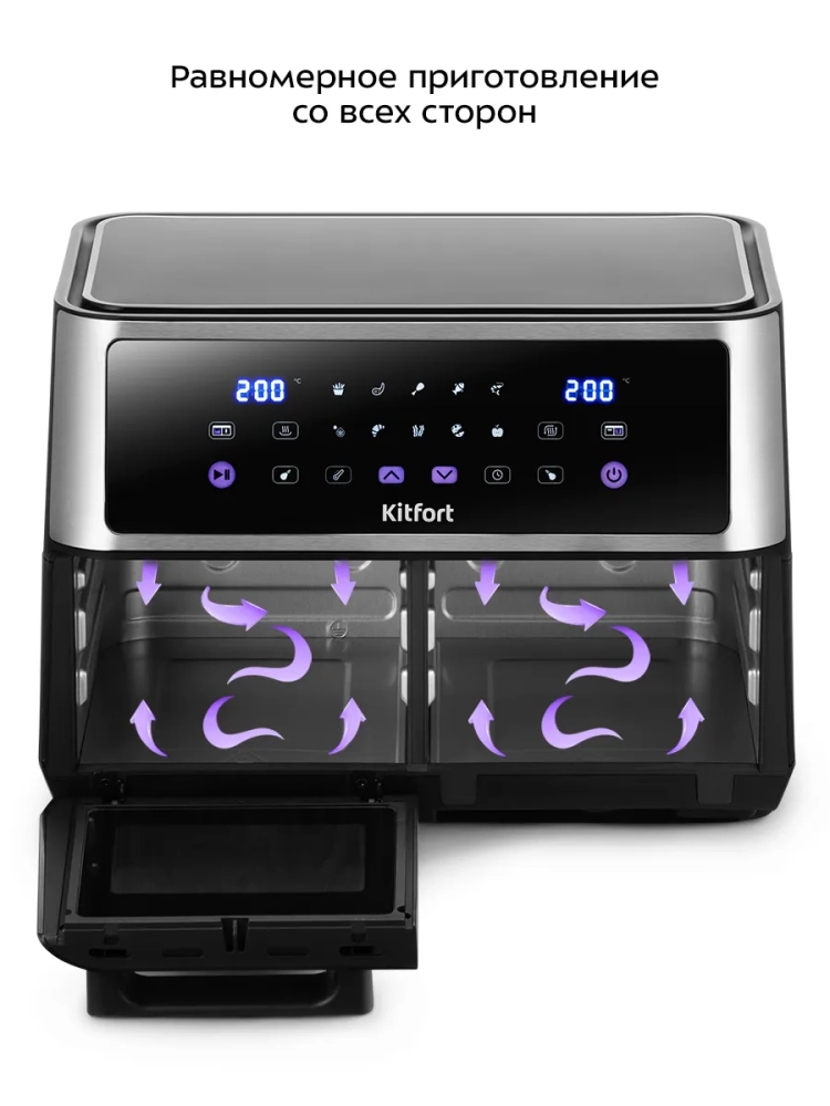 Аэрогриль "2 в 1" Kitfort КТ-2256 – это многофункциональный электрический прибор, который станет незаменимой техникой на вашей кухне. Он совмещает функции аэрогриля и духовки, а также может использоваться как сушилка для овощей и фруктов. Благодаря этому устройству вы сможете готовить большинство блюд, в том числе и выпечку, без масла, сохраняя их полезные свойства. Этот аэрогриль оснащен сенсорным управлением и предлагает 10 автоматических программ приготовления. Температура варьируется от 80 до 200 °С с шагом в 5 °С, что делает его универсальным для различных рецептов. В режиме сушки температура регулируется от 50 до 80 градусов с таймером от 1 до 24 часов. Особенность данного устройства заключается в наличии двух независимых частей с отдельными нагревателями, что позволяет одновременно готовить два разных блюда. Это удобно для тех случаев, когда нужно приготовить основное блюдо и гарнир к одному времени. Емкость поддона составляет целых пять литров, а чаша духовки – шесть литров. Решетка размером 230 х 190 мм обеспечивает равномерное распределение горячего воздуха по всей поверхности продуктов благодаря системе циркуляции воздуха продукты обжариваются со всех сторон равномерно и получаются нежными внутри с хрустящей корочкой снаружи. Этот электрический аэрогриль Kitfort станет незаменимым прибором на вашей кухне благодаря своей многофункциональности: он заменяет сразу несколько устройств – гриль, духовку и сушилку! Поддон легко моется после использования.