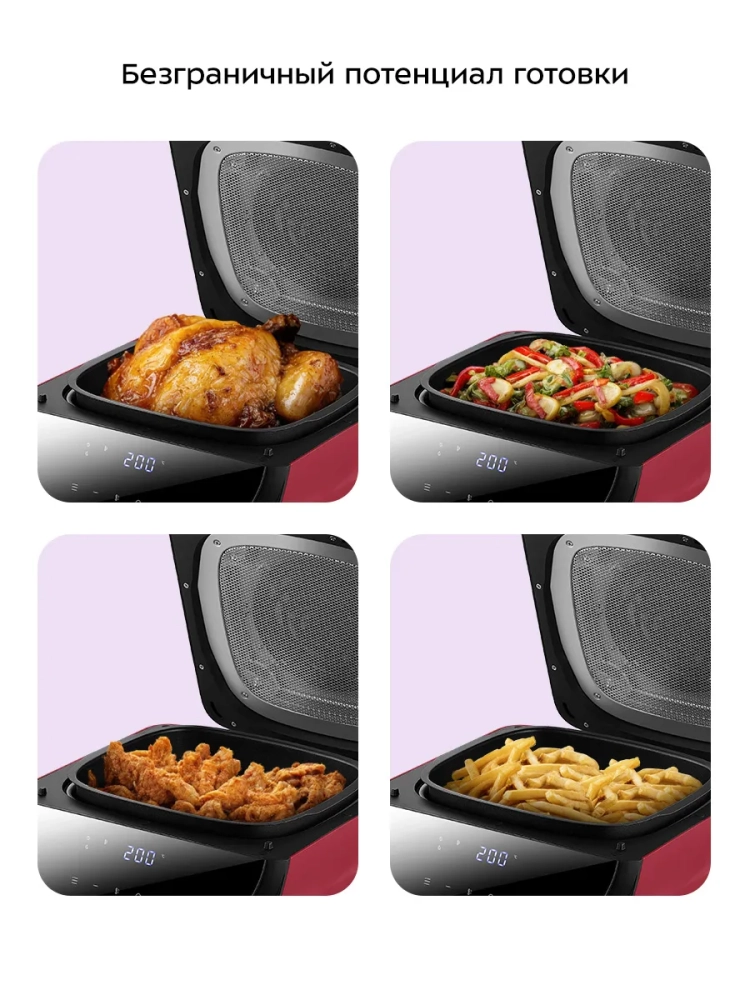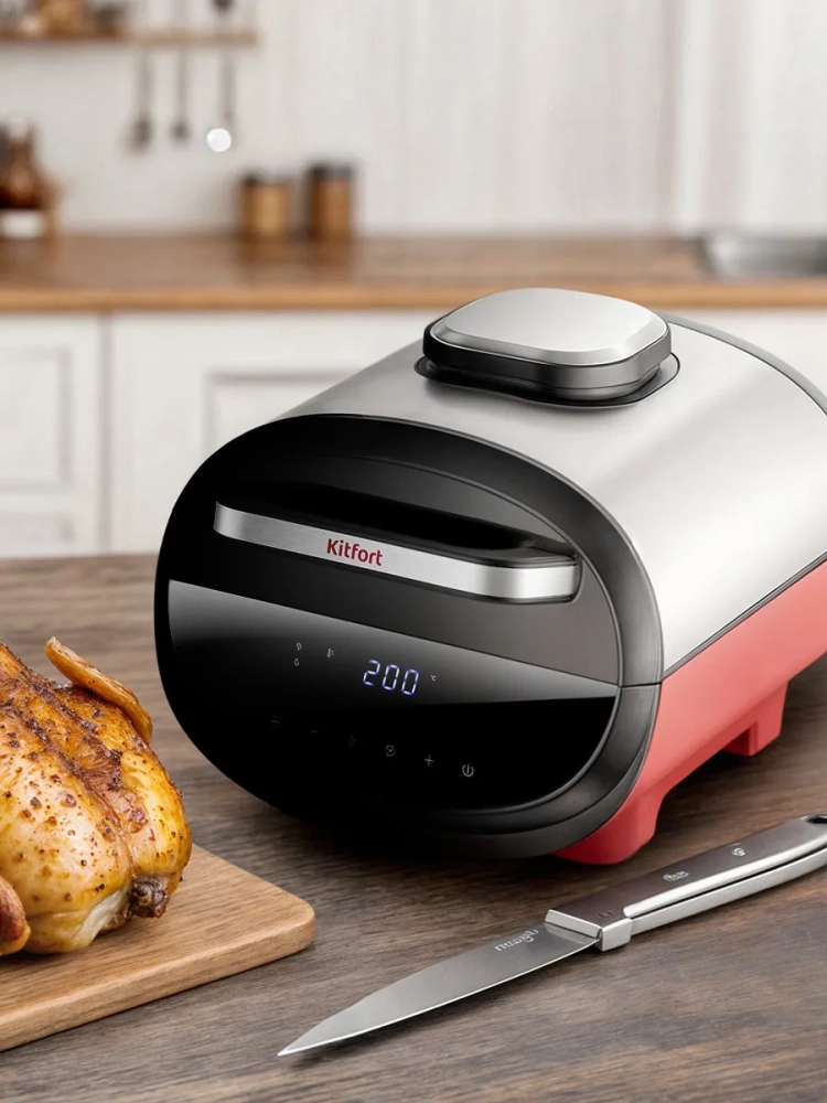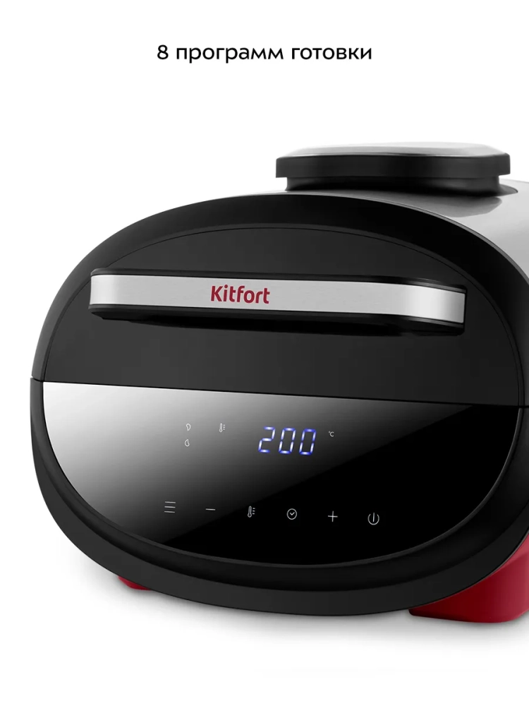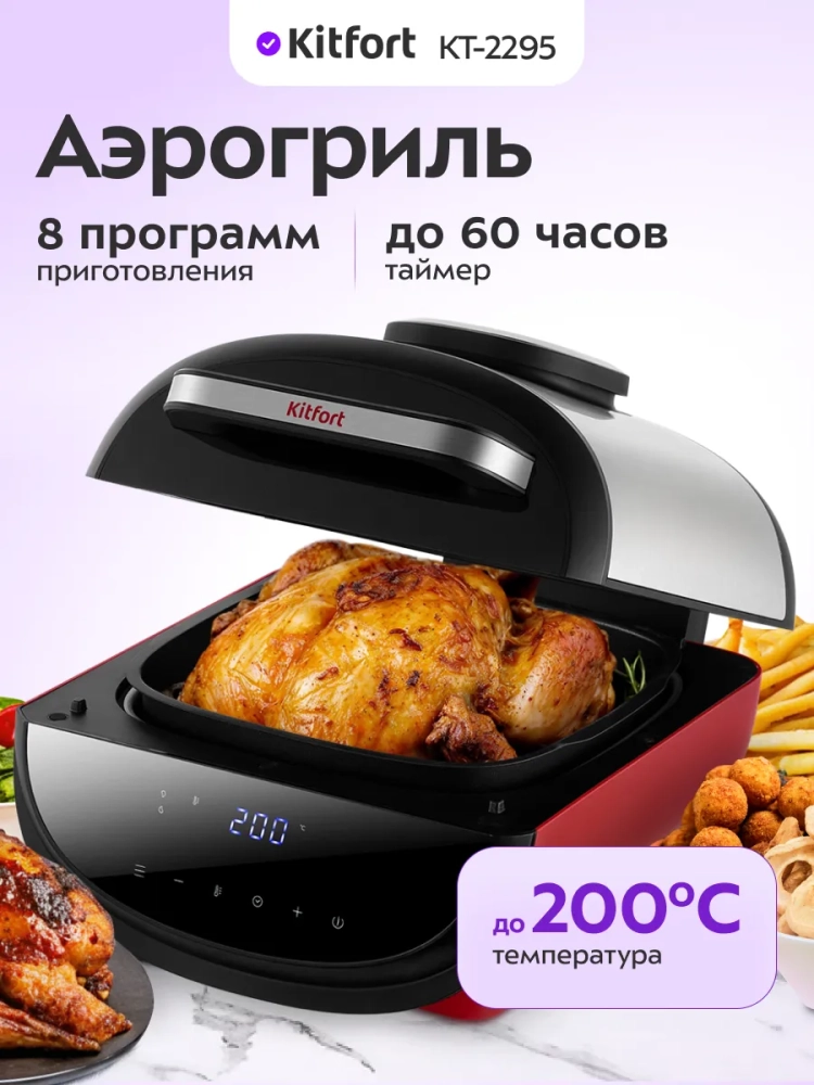 Аэрогриль электрический Kitfort КТ-2295 — это инновационный прибор для вашего дома, который станет незаменимым помощником на кухне. С помощью этой универальной техники вы сможете готовить разнообразные блюда без добавления масла, сохраняя их сочность и создавая аппетитную хрустящую корочку. Этот аэрогриль идеально подходит для кухни благодаря своей компактности и функциональности. Система циркуляции горячего воздуха обеспечивает равномерное обжаривание продуктов со всех сторон, делая их нежными внутри и хорошо запеченными снаружи. Благодаря этому прибору вам не придется постоянно находиться на кухне — достаточно правильно выставить температуру и время приготовления. Аэрогриль оснащен сенсорным управлением и дисплеем, что делает его использование максимально удобным. В комплекте с аэрогрилем идет специальная решетка, установленная в поддон с антипригарным покрытием. Это позволяет легко извлекать продукты после приготовления и мыть комплектующие без лишних усилий. Поддон имеет емкость 6,5 литров, что позволяет готовить большие порции за один раз. Электрический аэрогриль Kitfort предлагает 8 автоматических программ приготовления для различных блюд: от выпечки до жарки мяса или рыбы в режиме гриля. Встроенный термощуп помогает контролировать степень прожарки стейков или других продуктов без риска испортить их внешний вид. Этот бытовой настольный прибор обладает мощностью 1700 Вт. Температурный диапазон составляет от 80 до 200 °С, а таймер рассчитан на работу до 60 минут.