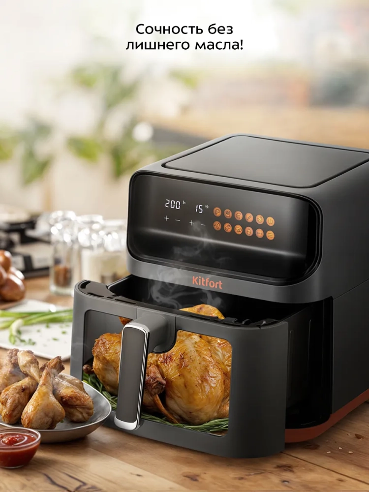 Аэрогриль электрический Kitfort КТ-8107 — это идеальный прибор для вашего дома, который сочетает в себе функции гриля и духовки. С объемом чаши 6,5 литра и мощностью 1350 Вт, он позволяет готовить разнообразные блюда без добавления масла. Благодаря системе циркуляции горячего воздуха продукты обжариваются равномерно со всех сторон, оставаясь сочными внутри и с хрустящей корочкой снаружи. Этот кухонный помощник оснащен девятью автоматическими программами приготовления и ручным режимом, что делает его использование простым и удобным. Вы можете выбрать подходящий рецепт из предложенных или настроить параметры самостоятельно — аэрогриль запомнит ваши предпочтения благодаря функции памяти. Электрический аэрогриль Kitfort оборудован дисплеем для отображения температуры и времени приготовления. Продукты размещаются на специальной решетке в поддоне с антипригарным покрытием, что облегчает процесс чистки после использования. Поддон легко вынимается для мытья. Этот бытовой прибор станет незаменимым на вашей кухне благодаря своей многофункциональности: от выпечки до жарки мяса или рыбы без лишнего жира. Аэрогриль также может использоваться как электрогриль или шашлычница для создания вкусных блюд прямо у вас дома. Kitfort КТ-8107 — это не просто техника для кухни; это ваш надежный помощник в приготовлении здоровой пищи каждый день! Он идеально подходит как настольный вариант устройства благодаря компактным размерам (283 × 355 × 311 мм) и современному дизайну.