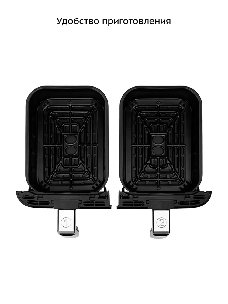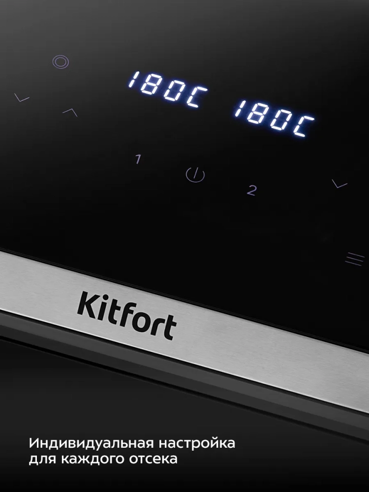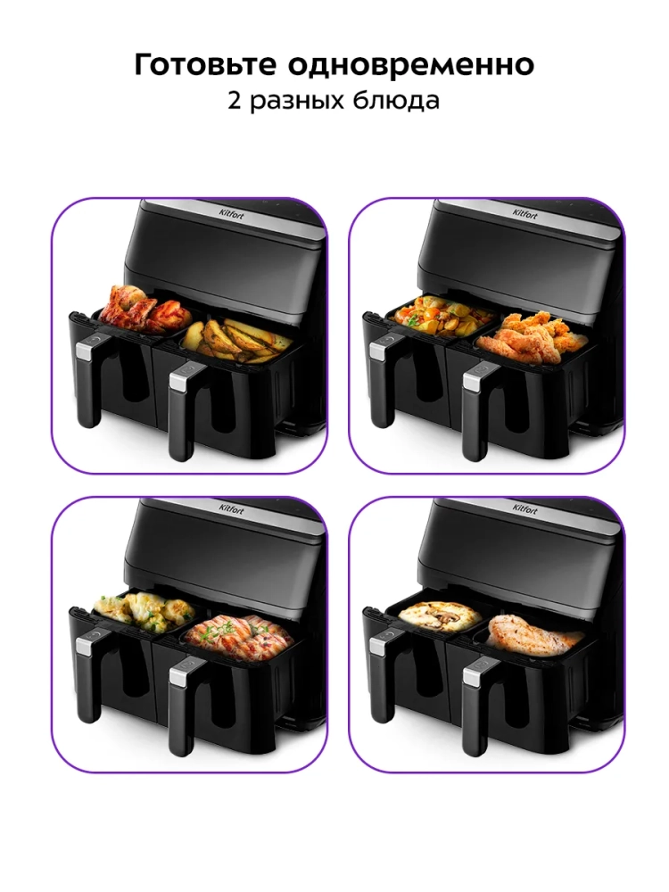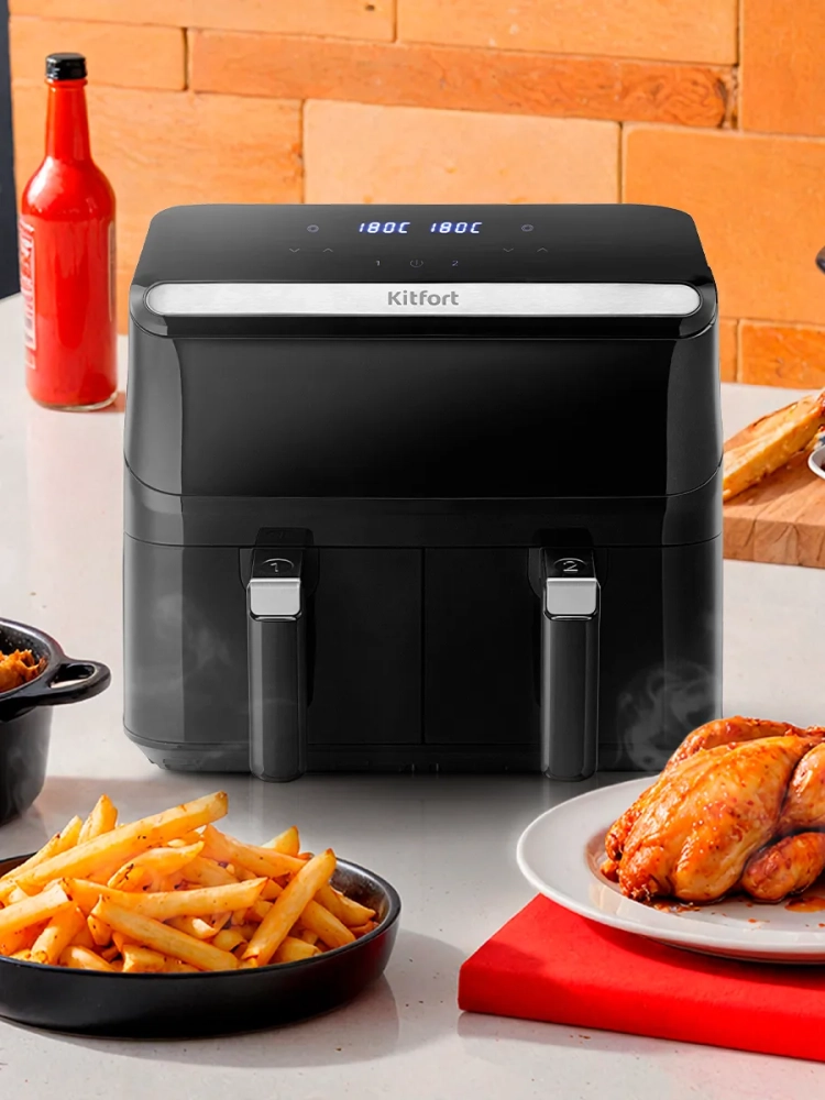 Аэрогриль электрический Kitfort КТ-2254 — это инновационный кухонный прибор, который позволяет готовить вкусные и полезные блюда без лишнего масла. С его помощью вы сможете насладиться сочными продуктами с хрустящей корочкой благодаря системе циркуляции горячего воздуха в гриле . Этот бытовой аэрогриль оснащен двумя поддонами по 4 литра каждый, что дает возможность готовить два блюда одновременно, используя индивидуальные настройки температуры и времени для каждого из них. Техника Kitfort KT-2254 предлагает шесть автоматических программ приготовления, которые упрощают процесс готовки. Сенсорное управление делает использование прибора интуитивно понятным и удобным. На дисплее отображаются текущие параметры приготовления: температура и время, а также активность нагревателей — левого или правого. Продукты размещаются на специальных решетках с антипригарным покрытием, что предотвращает пригорание пищи и облегчает уход за устройством. Решетки легко снимаются для мытья после использования. Благодаря наличию вентилятора все блюда равномерно обжариваются со всех сторон. Этот настольный аэрогриль идеально подходит для выпечки или жарки мяса и рыбы без постоянного контроля процесса на кухне. С мощностью 2200 Вт этот электрический прибор быстро справляется с задачами любой сложности на вашей кухне.