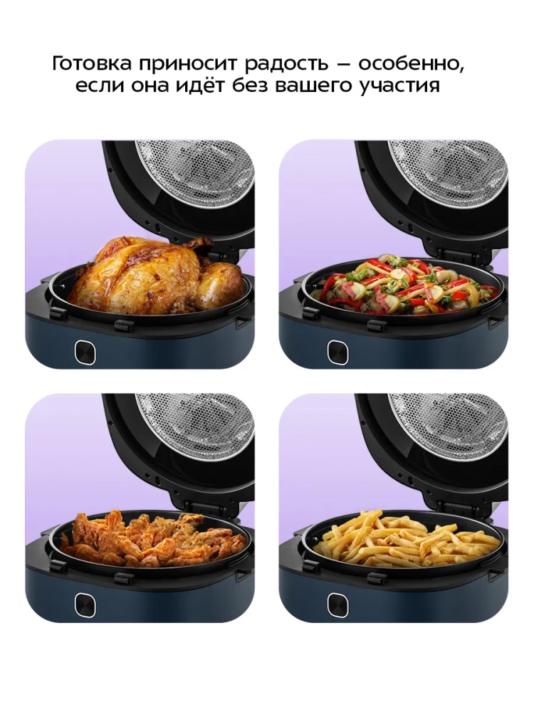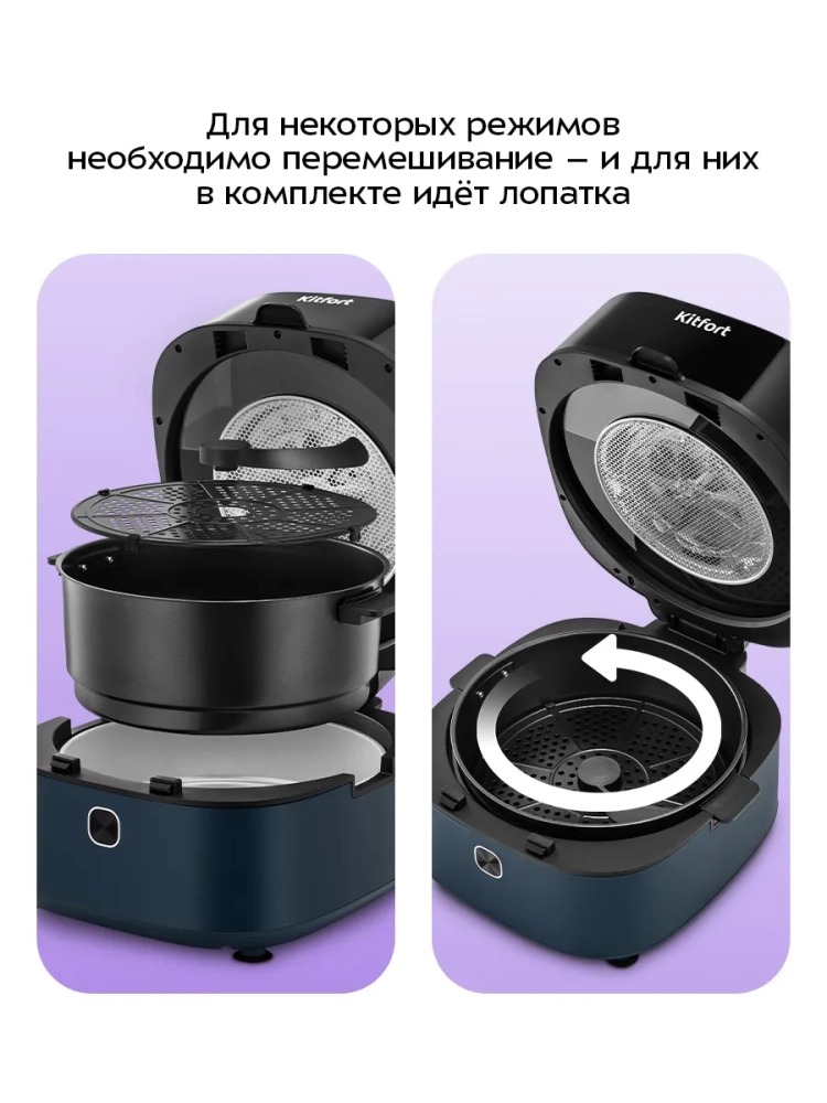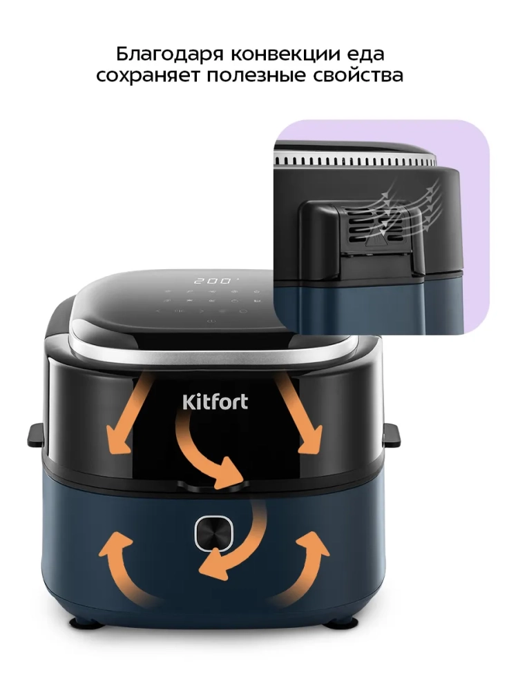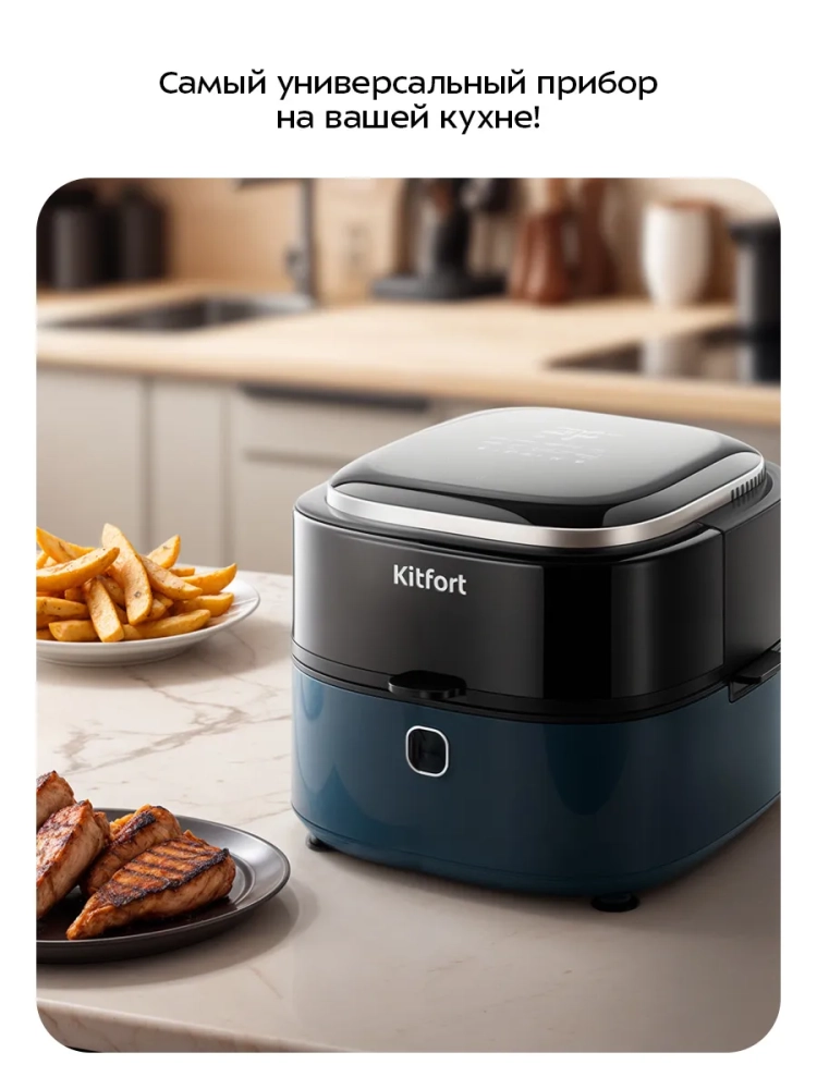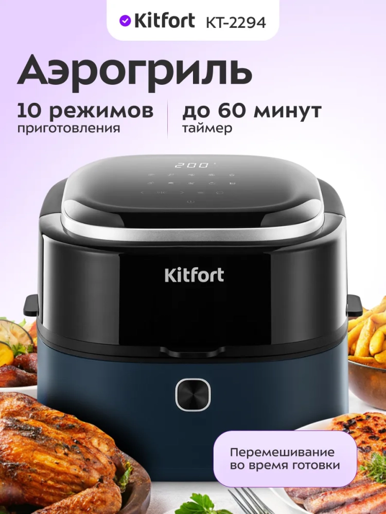 Аэрогриль электрический Kitfort КТ-2294 — это инновационный прибор для вашей кухни, который позволяет готовить разнообразные блюда, в том числе и выпечку, без лишнего масла. Благодаря системе циркуляции горячего воздуха, продукты обжариваются равномерно и остаются сочными внутри с аппетитной хрустящей корочкой снаружи. Этот аэрогриль оснащен сенсорным управлением и дисплеем, на котором отображаются температура и время приготовления. С помощью 10 автоматических программ вы сможете легко приготовить любимые блюда без необходимости постоянного контроля. Программы разработаны специально под конкретные рецепты, что делает процесс приготовления простым и удобным. Емкость поддона составляет 7 литров, что позволяет готовить большие порции за один раз. Продукты размещаются на специальной решетке с антипригарным покрытием, установленной в поддон. Внутри поддона находится лопатка для перемешивания продуктов во время приготовления. По окончании процесса аэрогриль автоматически отключается. Мощность устройства составляет 1350 Вт при напряжении ~220–240 В и частоте 50/60 Гц. Температурный диапазон от 80 до 200 °С позволяет выбрать оптимальные условия для каждого блюда, а таймер до 60 минут обеспечивает удобство использования. Передние ножки оборудованы присосками для устойчивости прибора при открывании крышки гриля. Длина шнура составляет 0,8 м, а размеры устройства — компактные: 390 х 349 х 281 мм. Этот электрический аэрогриль Kitfort станет незаменимым помощником на вашей кухне благодаря своей функциональности и простоте в использовании! Поддон и решетка легко вынимаются для мытья.