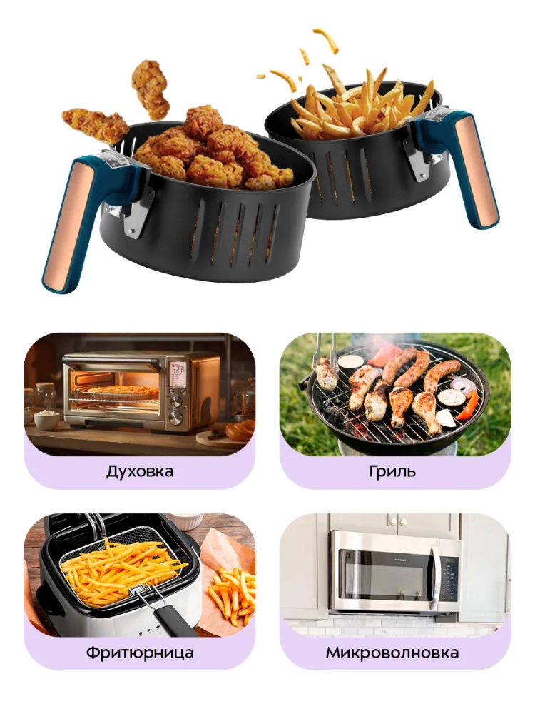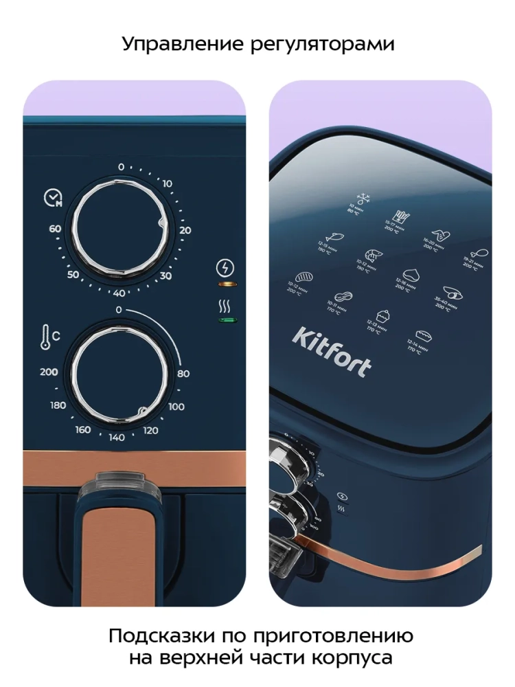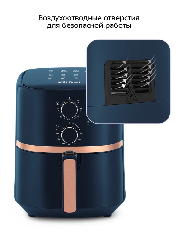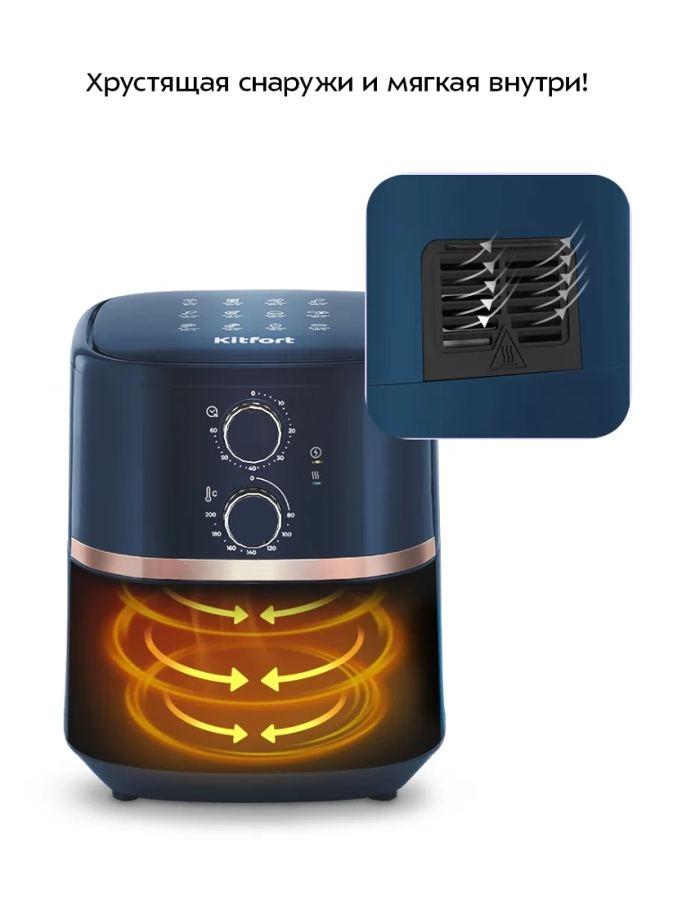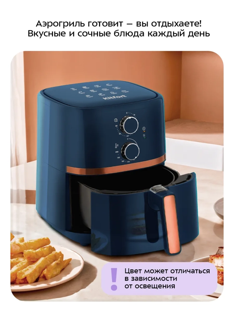Аэрогриль электрический Kitfort КТ-8106 — это современный кухонный настольный прибор, который станет незаменимым помощником на вашей кухне. С его помощью можно готовить разнообразные блюда, в том числе выпечку и пиццу, без добавления масла, сохраняя их сочность и создавая аппетитную хрустящую корочку. Этот аэрогриль оснащен системой циркуляции горячего воздуха, что позволяет равномерно обжаривать продукты со всех сторон. Благодаря этому ваши блюда будут нежными внутри и хорошо запеченными снаружи. Электрический аэрогриль Kitfort имеет механическое управление, позволяющее устанавливать температуру от 80 до 200 °С и время приготовления до 60 минут. Это делает процесс готовки простым и удобным, не требующим постоянного присутствия на кухне. Продукты помещаются в специальную корзину с антипригарным покрытием, установленную в поддон — также с антипригарным покрытием для легкой очистки. Емкость корзины — 3,2 литра, что позволяет готовить в гриле достаточно большие порции за один раз. Аэрогриль автоматически отключается по окончании приготовления для вашей безопасности. Этот электрогриль идеально подходит для тех, кто ценит здоровое питание без лишнего жира и масла. Он поможет вам приготовить вкусные блюда быстро и легко благодаря встроенному вентилятору для равномерного распределения тепла. Kitfort КТ-8106 — это надежная техника для кухни с классом защиты I от поражения электрическим током. Длина шнура составляет всего 0,6 м при компактных размерах устройства: 280 х 355 х 338 мм.