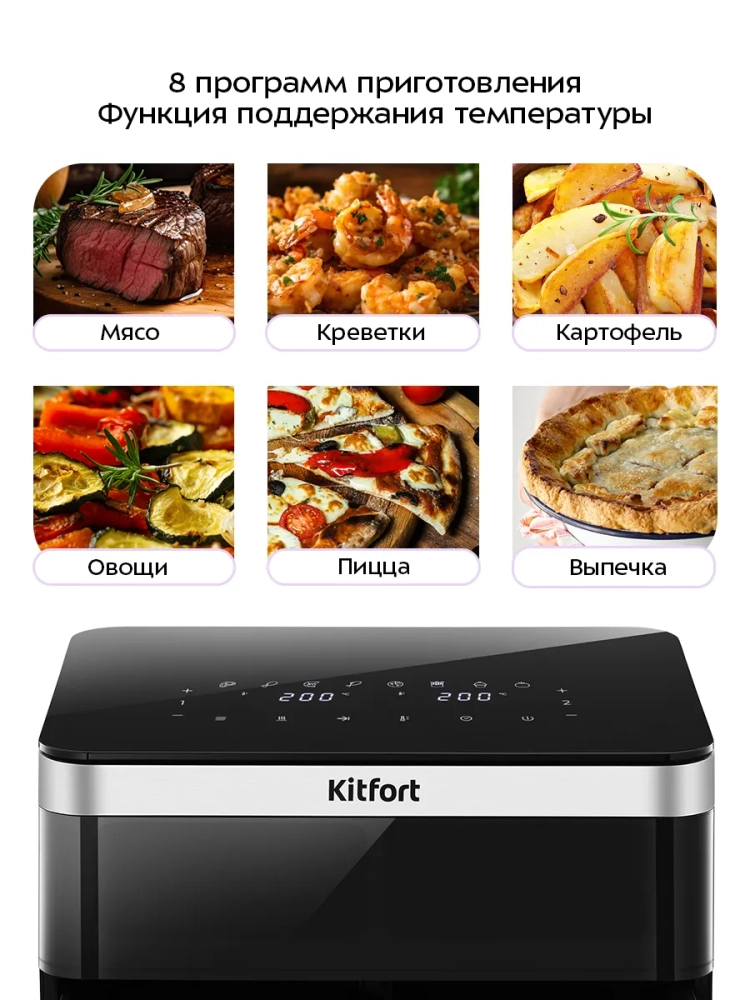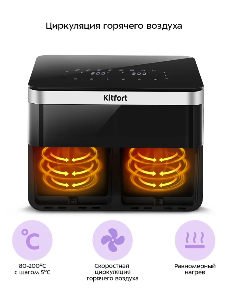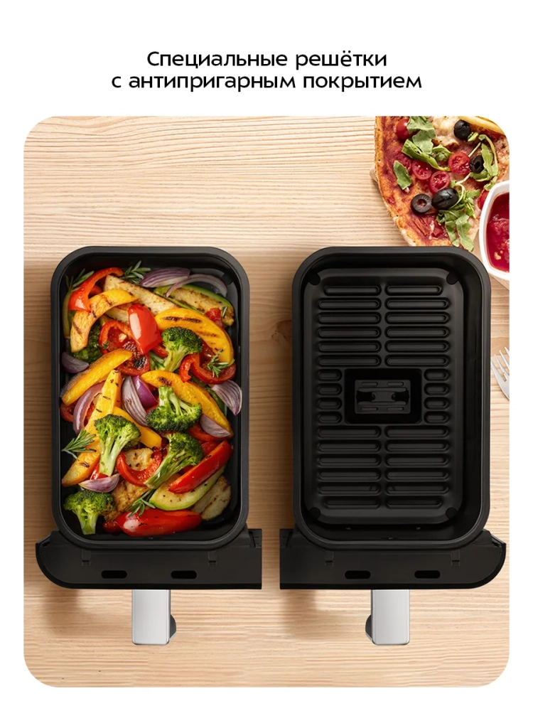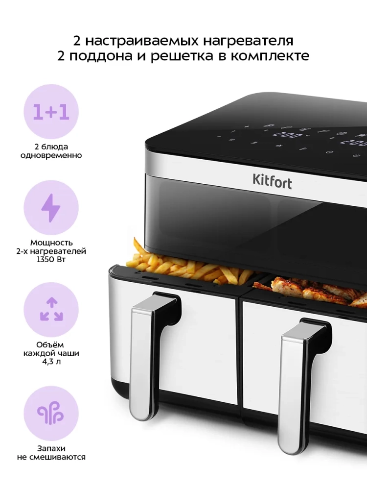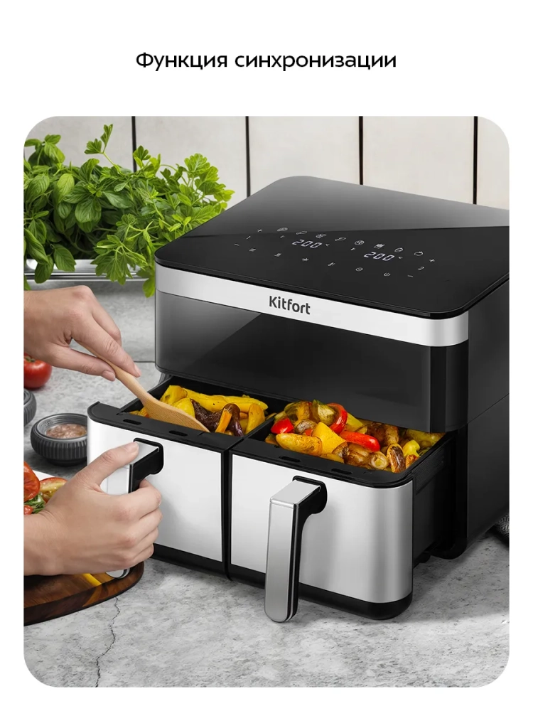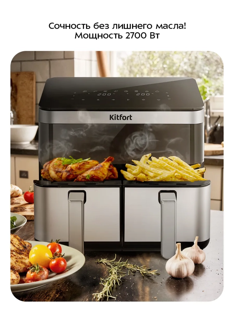 Аэрогриль электрический Kitfort КТ-8110 — это современное устройство для приготовления пищи, которое позволяет готовить большинство продуктов без добавления масла. Благодаря этому аэрогрилю, блюда получаются сочными и с хрустящей корочкой. Система циркуляции горячего воздуха обеспечивает равномерное обжаривание продуктов со всех сторон, делая их нежными внутри и хорошо запеченными снаружи. Этот электрический аэрогриль оснащен двумя нагревателями и двумя поддонами по 4,3 литра каждый, что позволяет готовить два блюда одновременно. Вы можете установить индивидуальные настройки температуры и времени для каждого блюда благодаря функции синхронизации времени окончания приготовления. Это значит, что основное блюдо и гарнир будут готовы к одному времени. Сенсорное управление делает использование устройства простым и удобным: на дисплее отображаются температура и время приготовления. Аэрогриль предлагает 8 автоматических программ приготовления, которые позволяют использовать готовые шаблоны настроек для различных блюд без необходимости постоянного контроля процесса. Продукты размещаются на специальных решетках в поддонах с антипригарным покрытием — это предотвращает пригорание пищи даже при минимальном количестве масла или его отсутствии вовсе. Решетки легко вынимаются из поддонов для мытья после использования. Аэрогриль идеально подходит как для домашней кухни, так и для дачи благодаря своей универсальности в приготовлении разнообразных блюд от курицы до рыбы или выпечки.