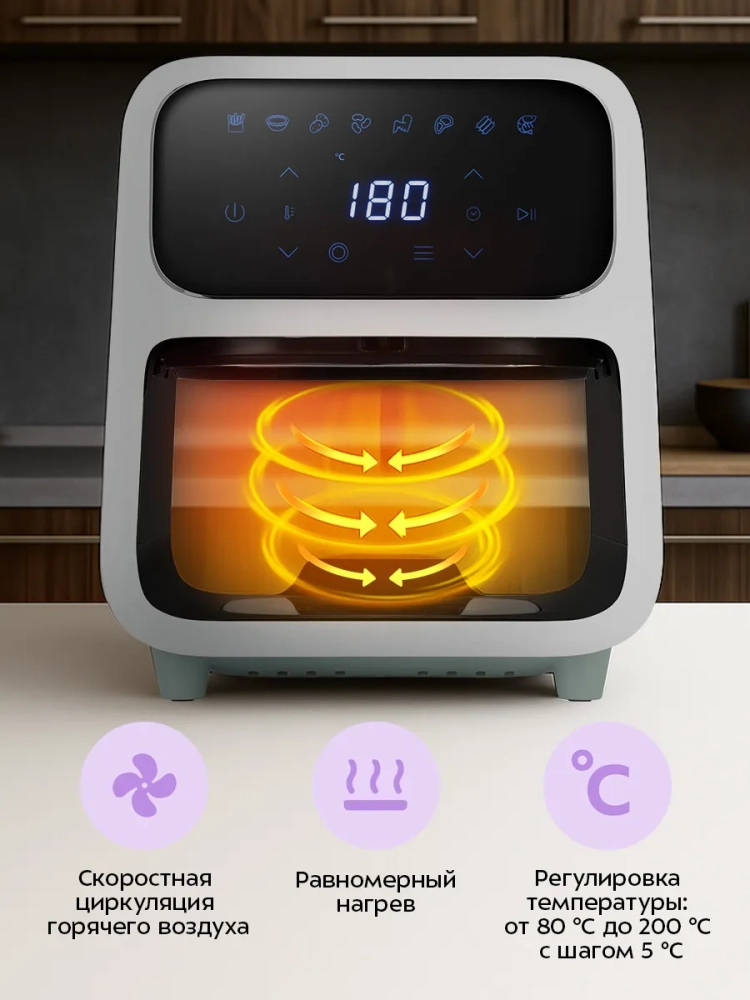 Аэрогриль оснащен сенсорным управлением и 8 автоматическими программами приготовления. Программы позволяют использовать готовые шаблоны настроек, разработанные специально под конкретные блюда, поэтому вам не придется контролировать процесс приготовления самостоятельно. На дисплее отображаются температура и время приготовления.