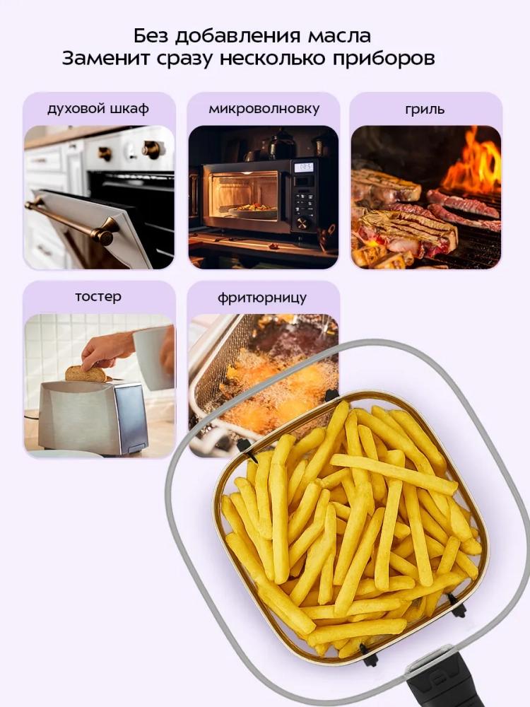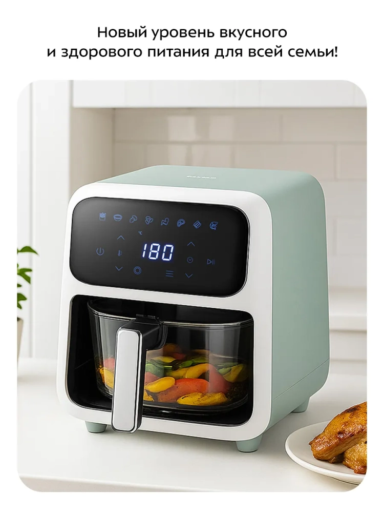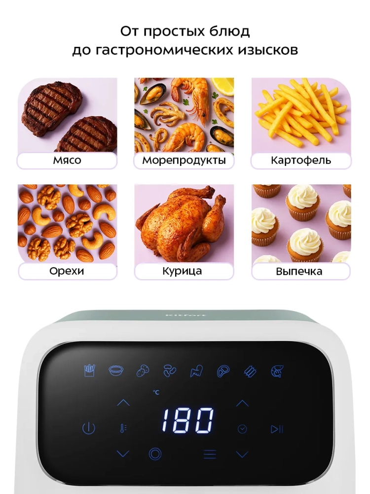 Современный аэрогриль Kitfort КТ-8147 позволяет готовить большинство продуктов без добавления масла, при этом они получаются сочными и с хрустящей корочкой.