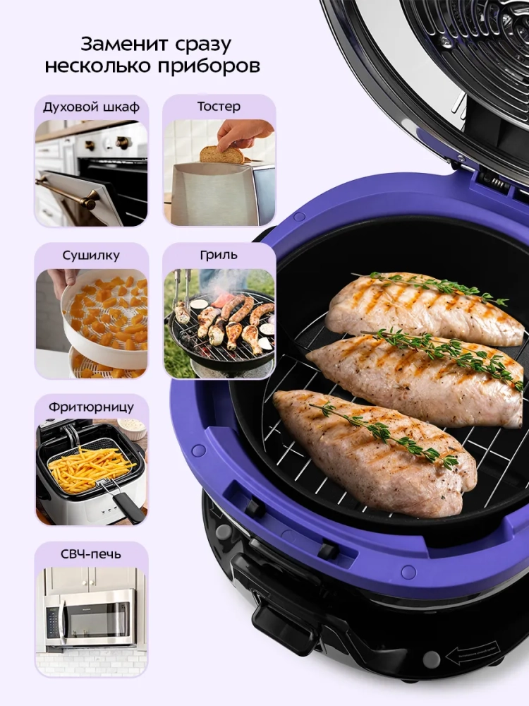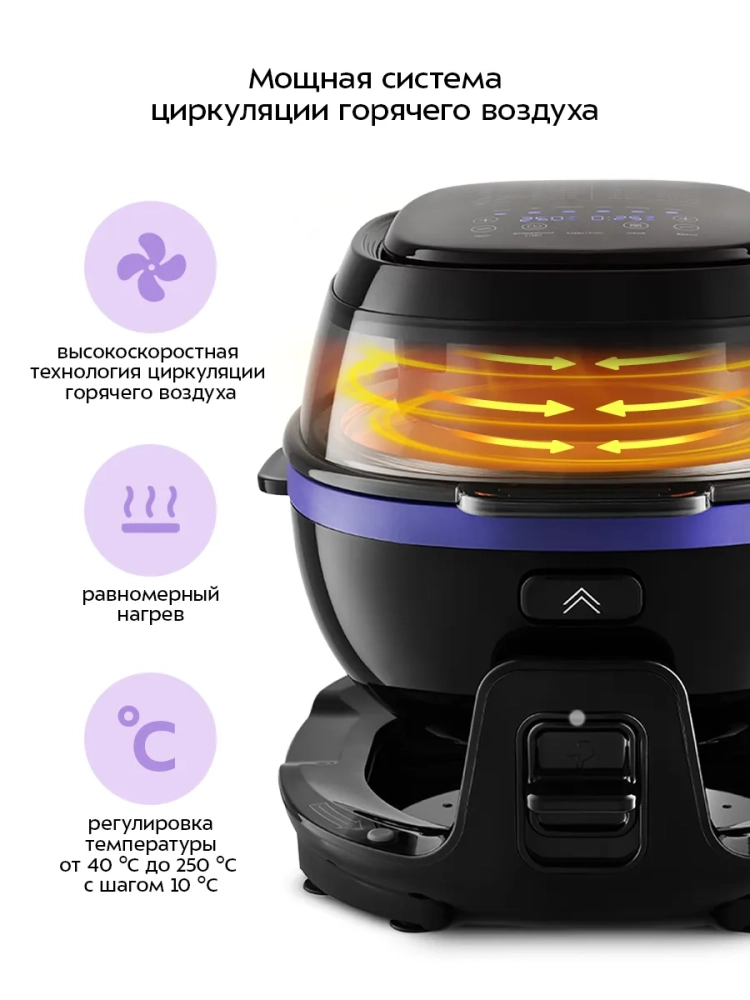 Аэрогриль электрический Kitfort КТ-2218 — это современный прибор, который сочетает в себе стильный дизайн и функциональность. Этот аэрогриль позволяет готовить большинство блюд без добавления масла благодаря системе циркуляции горячего воздуха. Продукты равномерно обжариваются со всех сторон, оставаясь нежными внутри и приобретая хрустящую корочку снаружи. Электрический аэрогриль Kitfort оснащен электронным управлением и удобным дисплеем, на котором отображаются температура, время приготовления и скорость вращения вентилятора. У прибора есть 6 автоматических программ для разнообразных рецептов, а также функция отложенного старта для удобства планирования времени готовки. Продукты помещаются в специальную чашу с антипригарным покрытием, которая легко снимается для очистки и может вращаться во время приготовления. Это обеспечивает равномерное распределение тепла по всей поверхности продуктов. Ножки с присосками предотвращают опрокидывание аэро гриля при открывании крышки. По окончании процесса приготовления аэрогриль автоматически отключается, что делает его использование безопасным и экономичным в плане энергопотребления. Электрогриль Kitfort КТ-2218 мощностью 1400 Вт станет незаменимым помощником на вашей кухне. Этот айрогриль идеально подходит для тех, кто ценит качество приготовленных блюд без лишних жировых добавок. Тэн устройства обеспечивает быстрое нагревание до нужной температуры.