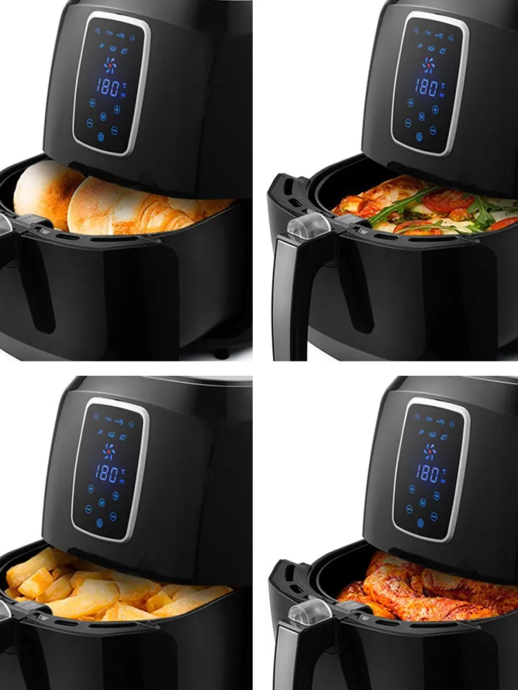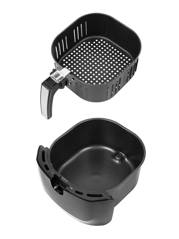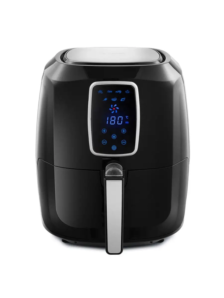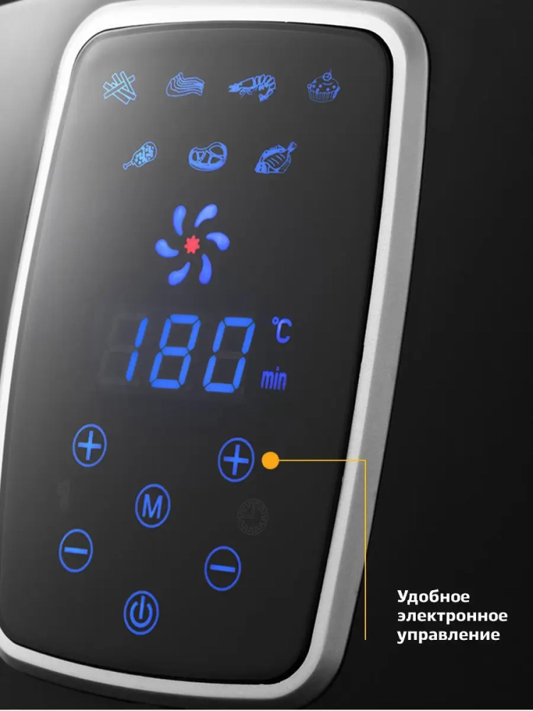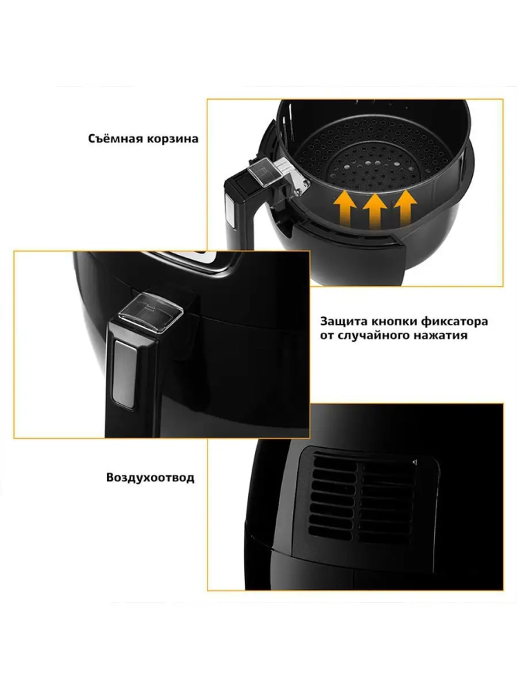 Аэрогриль электрический Kitfort KT-2208 — это современный кухонный прибор, который сочетает в себе функции аэрогриля, электрогриля, аэрофритюрницы, гриля и духовки. Он позволяет готовить разнообразные блюда без добавления масла благодаря системе циркуляции горячего воздуха. Это обеспечивает равномерное обжаривание продуктов со всех сторон, делая их нежными внутри и с хрустящей корочкой снаружи. Электрический аэрогриль оснащен электронным управлением и дисплеем, что делает его использование простым и удобным. Семь автоматических программ позволяют выбрать оптимальный режим для приготовления различных блюд по рецептам. Продукты размещаются в специальной корзине объемом 5,2 литра, которая вставляется в поддон с антипригарным покрытием. Поддон легко вынимается для мытья после использования. Этот кухонный прибор идеально подходит для приготовления мяса, овощей, выпечки, пиццы и других продуктов без лишнего жира. Аэрогриль автоматически отключается по окончании процесса готовки, обеспечивая безопасность использования. Kitfort KT-2208 — это не только функциональная и удобная в использовании техника, но также стильный дизайн, который украсит любую кухню. Его компактные размеры позволяют разместить его даже на небольшой кухне без ущерба для пространства. Если вы ищете надежного настольного помощника на вашей кухне для быстрого приготовления вкусных блюд с минимальными усилиями — этот аэрогриль станет отличным выбором!