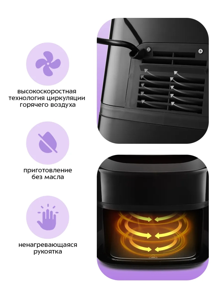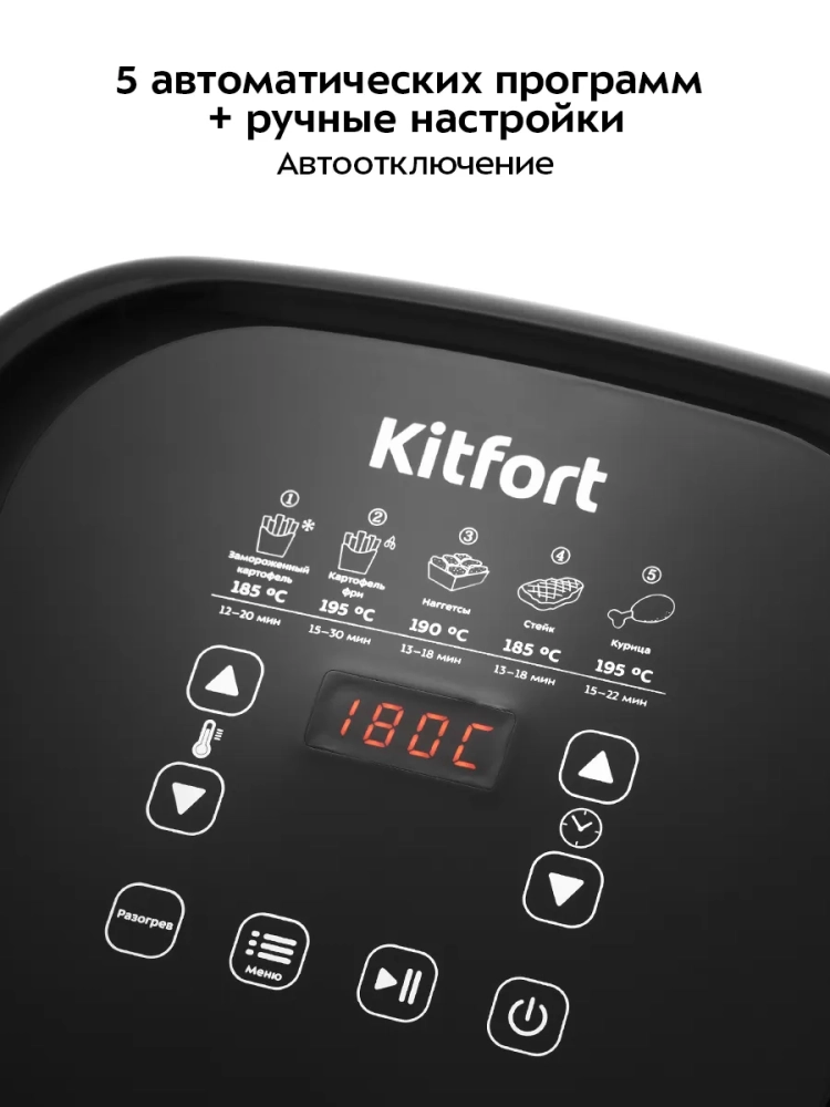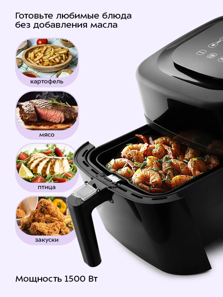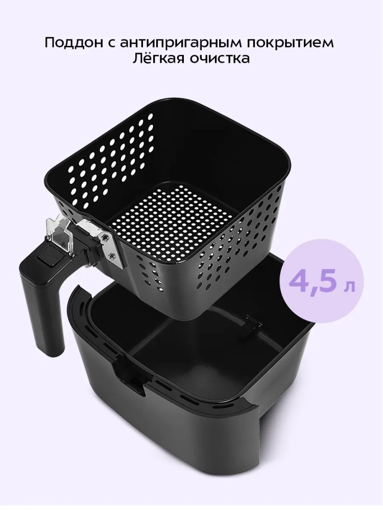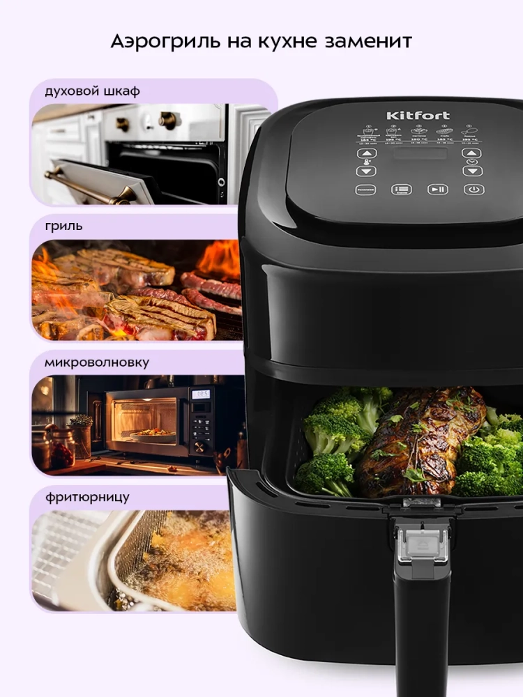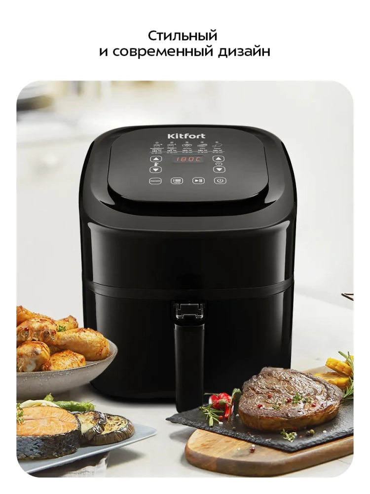 Аэрогриль электрический Kitfort КТ-2215 — это инновационный прибор, который станет незаменимым помощником на вашей кухне. Этот аэрогриль обладает стильным дизайном и многофункциональностью, позволяя использовать его как аэрофритюрницу, гриль и духовку. Благодаря этому устройству вы сможете готовить большинство блюд без добавления масла, что делает его идеальным для тех, кто следит за своим питанием. Электрический аэрогриль Kitfort оснащен электронным управлением с пятью автоматическими программами приготовления. На удобном дисплее отображаются температура и время приготовления, что позволяет легко контролировать процесс готовки. Продукты размещаются в специальной корзине с антипригарным покрытием, которая вставляется в поддон — также с антипригарным покрытием. Это обеспечивает легкость ухода за прибором: корзина и поддон легко вынимаются и моются. С объемом 4.5 литра этот бытовой прибор подходит для приготовления разнообразных блюд на любой вкус — от выпечки до жарки мяса или овощей. Мощность устройства составляет 1500 Вт, что гарантирует быстрое приготовление пищи без потери вкусовых качеств. Kitfort КТ-2215 автоматически отключается по окончании программы приготовления, обеспечивая безопасность использования на кухне. Этот кухонный аэрогриль станет отличным дополнением к вашему набору бытовой техники благодаря своей универсальности и простоте в использовании. Аэрогриль электрический идеально впишется в любую кухню благодаря своему современному дизайну. Электрический гриль может заменить традиционную духовку или фритюрницу при приготовлении различных блюд.
