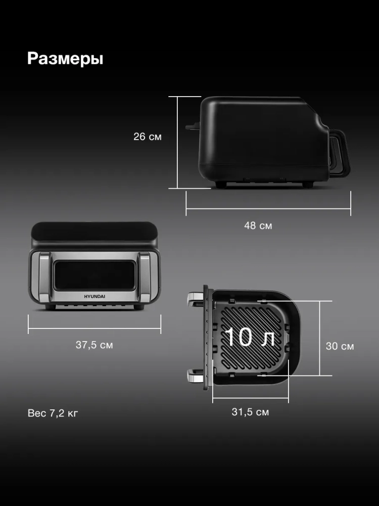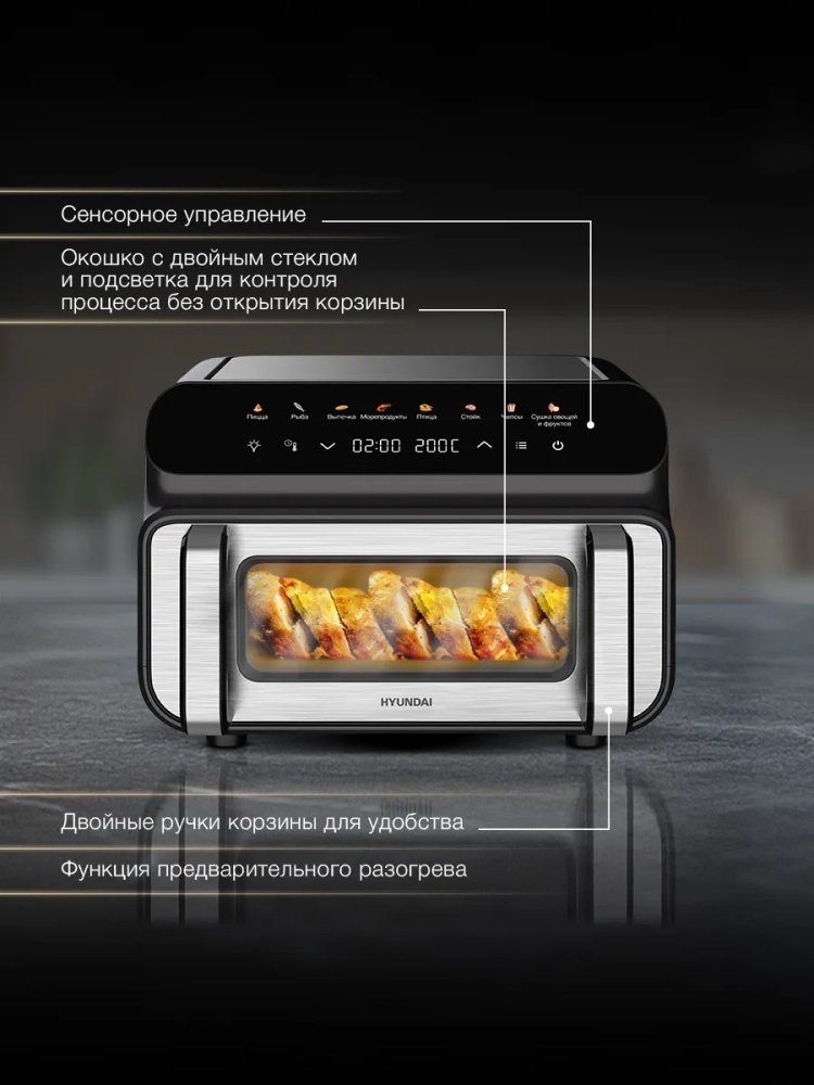 Аэрогриль Hyundai HYF-9080 черный/серебристый, мощность 2000Вт, нагревательный элемент: ТЭН. Аэрогриль позволяет готовить с минимальным количеством масла или совсем без него. Блюда будут более полезными, с хрустящей корочкой снаружи и нежная внутри. Окошко и подсветка для визуального контроля без открытия камеры. Верхний и нижней ТЭНы для оптимальной прожарки со всех сторон и минимизации перемешивания.Широкий выбор температуры от 50С° вы можете сушить продукты, а так же делать глубокую зажарку при 230С°. Внутреняя камера сделана из металла, что обеспечивает стабильную температуру и более долговечна. Дно корзины сделано по принипу сковородки гриль, для качественной прожарки стейков.