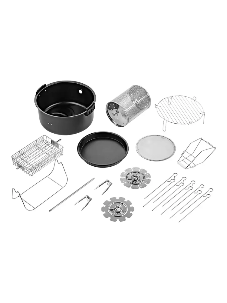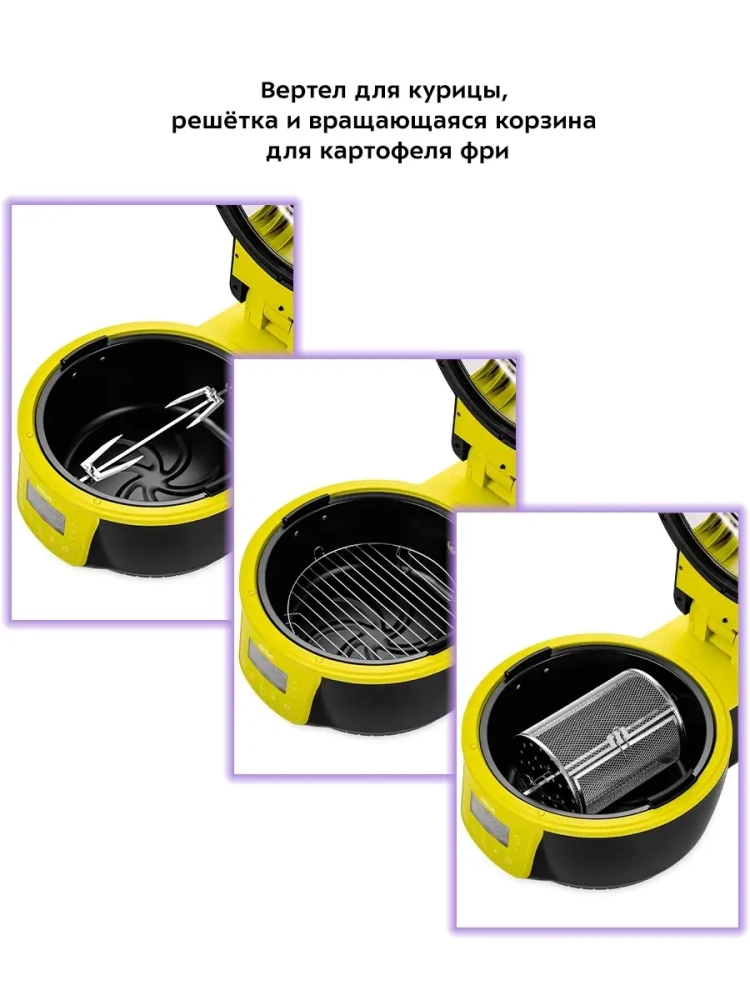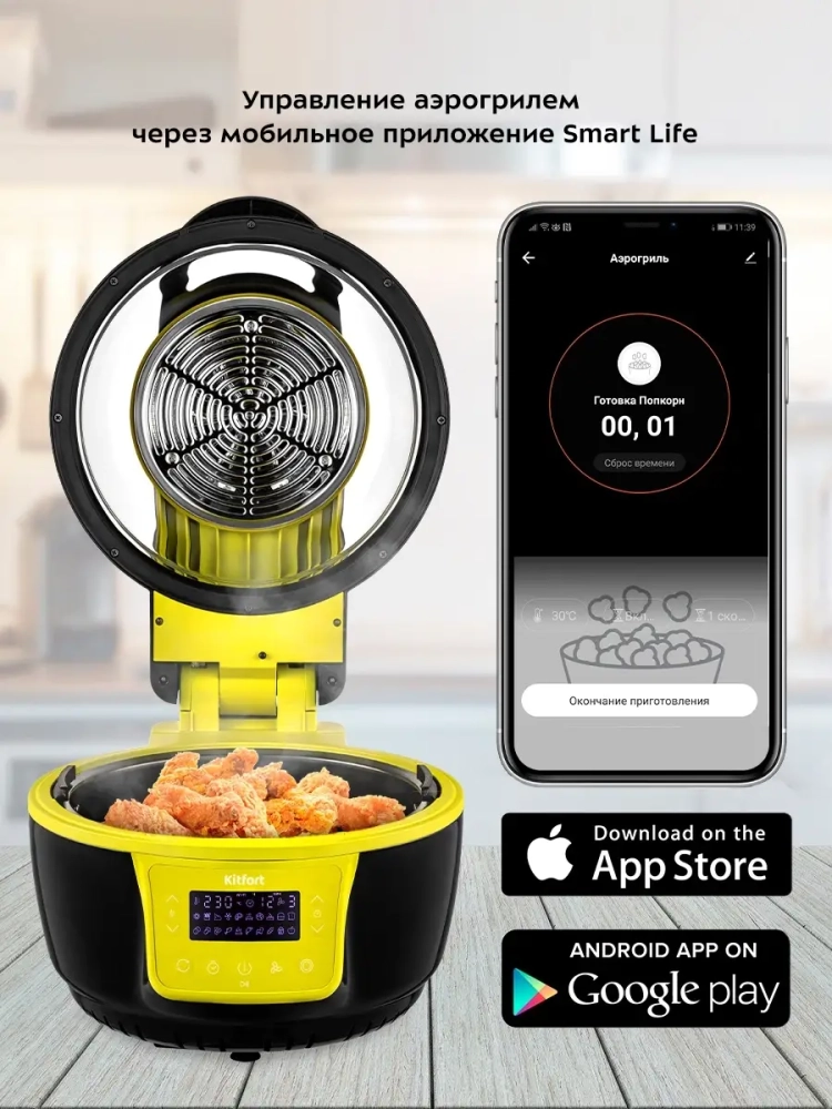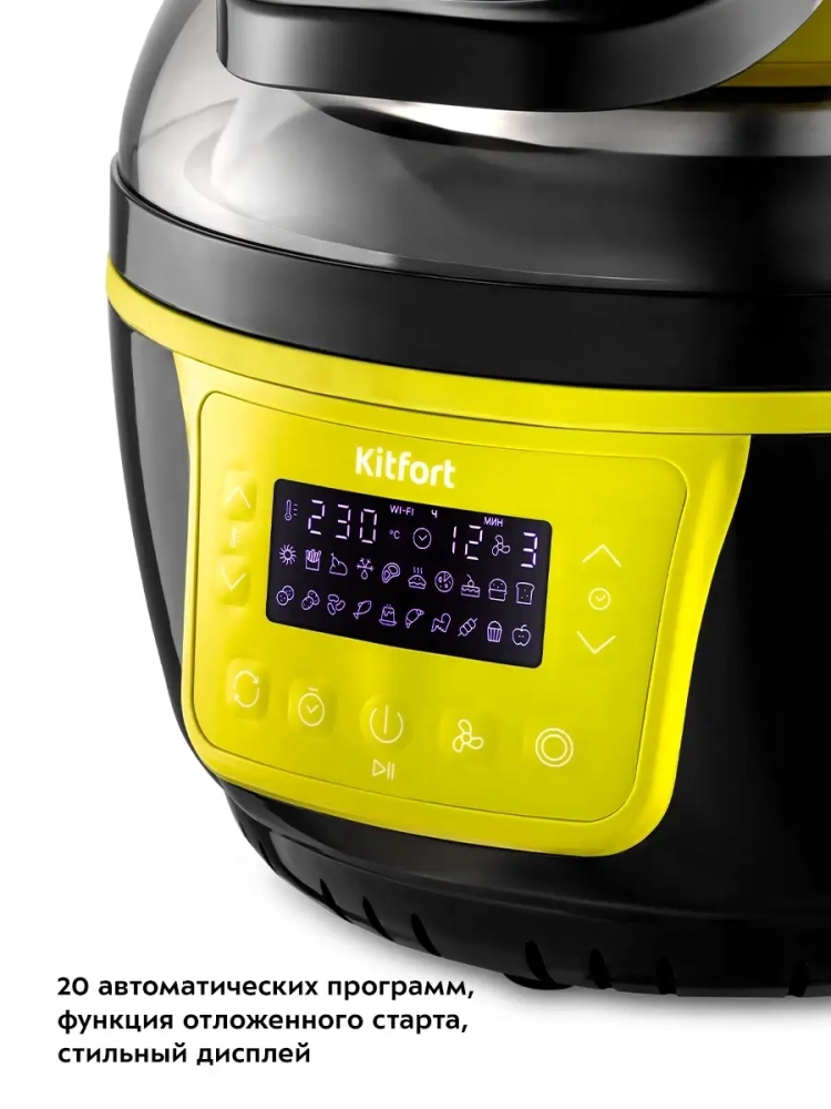 Аэрогриль электрический Kitfort КТ-2243 — это современное бытовое кухонное устройство, которое сочетает в себе стильный дизайн и функциональность. С его помощью можно готовить разнообразные блюда, в том числе и выпечку, без добавления масла, благодаря системе циркуляции горячего воздуха. Продукты обжариваются равномерно, оставаясь нежными внутри и с хрустящей корочкой снаружи. Электрический аэрогриль оснащен электронным управлением и дисплеем, на котором отображаются температура, время приготовления и скорость вентилятора. Чаша объемом 7.5 литра имеет антипригарное покрытие для удобства использования и легкости очистки. В комплекте идут вертел, щипцы, решетка для стейков и другие аксессуары для разнообразных кулинарных экспериментов. Решетка позволяет готовить большие куски мяса или использовать термостойкие чаши прямо в аэрогриле. Функция отложенного старта дает возможность начать приготовление в удобное время, а галогеновый нагреватель подсвечивает продукты во время работы устройства. Прозрачная часть крышки позволяет наблюдать за процессом приготовления без необходимости открывать её. Kitfort КТ-2243 поддерживает подключение через WI-FI к приложению Smart Life для дистанционного управления устройством через смартфон. Это делает использование аэрогриля ещё более комфортным и современным. Ножки с присосками обеспечивают устойчивость прибора на кухне при открывании крышки гриля. По окончании процесса приготовления устройство автоматически отключается для вашей безопасности.