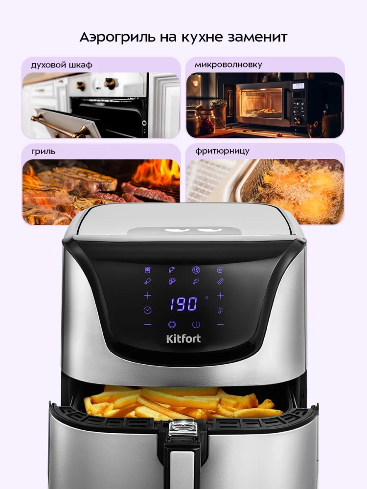 Аэрогриль КТ-2232 от Kitfort — это современное устройство, которое сочетает в себе функции аэрогриля, электрогриля, аэрофритюрницы и духовки. Благодаря этому прибору вы сможете готовить разнообразные блюда, в том числе и выпечку, без использования масла, что делает пищу более здоровой и полезной. Однако при желании можно добавить немного масла для создания хрустящей корочки или ароматизации блюд масляно-травяной смесью. Для этого достаточно слегка смазать курицу, рыбу или отбивную с помощью силиконовой кисточки. Основное преимущество аэрогриля Kitfort заключается в системе циркуляции горячего воздуха, которая обеспечивает равномерное обжаривание продуктов со всех сторон. Устройство оснащено сенсорным управлением и предлагает 8 автоматических программ приготовления, а также возможность ручной настройки параметров. На дисплее отображаются температура и время приготовления. Продукты размещаются в специальной корзине с антипригарным покрытием, которая вставляется в поддон. Поддон также имеет антипригарное покрытие для удобства использования и легкости очистки после готовки. По окончании процесса приготовления аэрогриль автоматически отключается для вашей безопасности. Этот гриль идеально подходит для любителей картофеля фри благодаря своей способности готовить его без лишнего жира. Аэрогриль Kitfort станет незаменимым настольным помощником на вашей кухне благодаря своей многофункциональности и простоте использования.