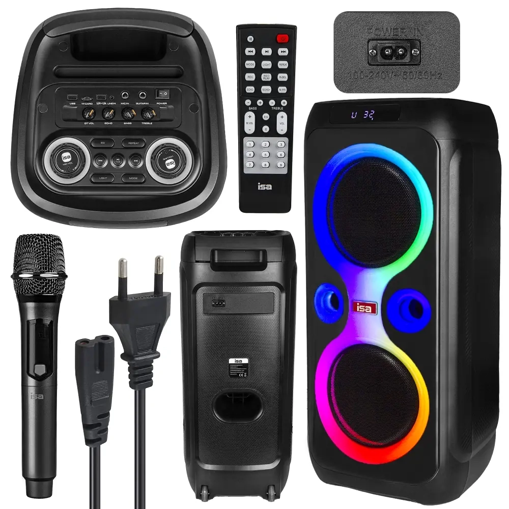 Особенности: встроенная RGB подсветка; изменение уровня высоких\низких частот; управление эхом\громкостью гитары; порт для подключения гитары; выдвижная ручка для транспортировки,