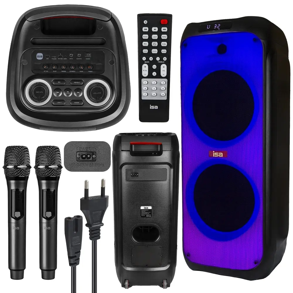 Особенности: встроенная RGB подсветка; изменение уровня высоких\низких частот; изменение уровня высоких\низких частот микрофона; управление эхом\громкостью гитары; порт для подключения гитары, USB порт для зарядки 5V1.5A; 2 колеса для транспортировки акустической системы.