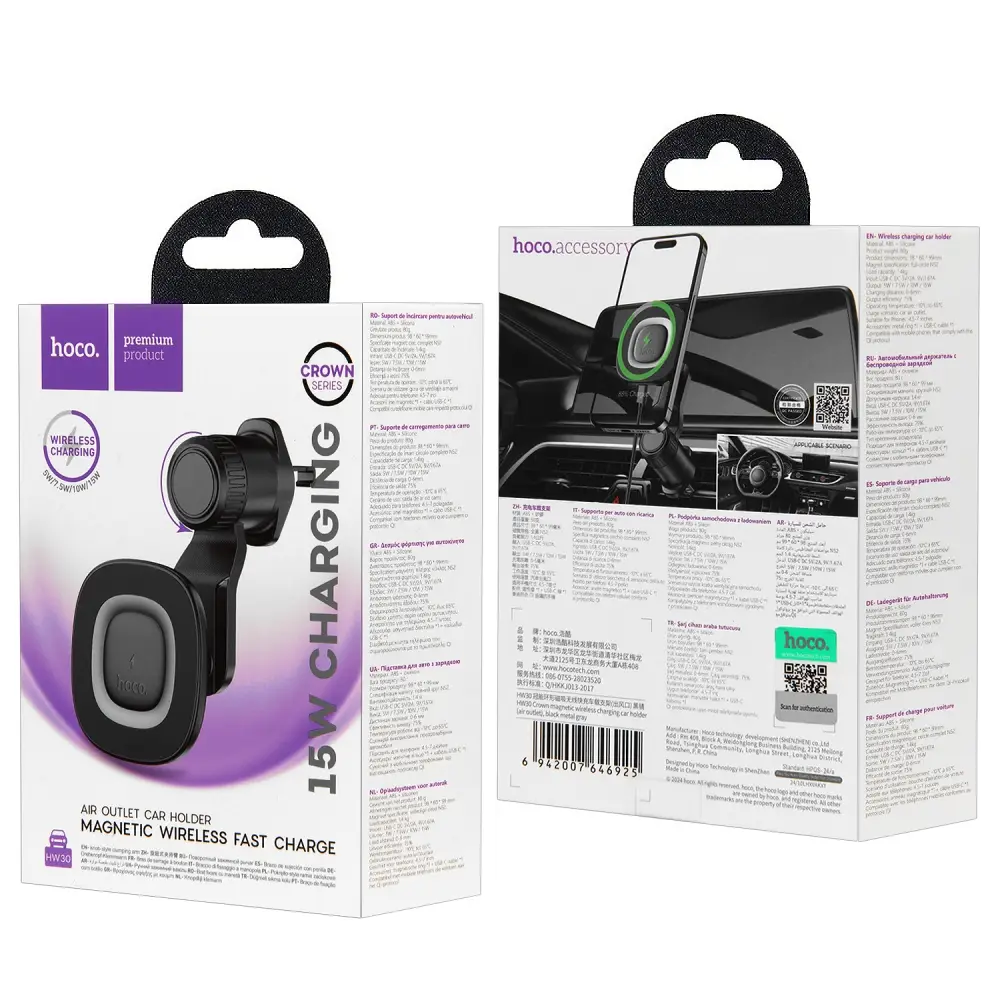 Держите ваш смартфон всегда под рукой с автомобильным держателем HOCO HW30! Этот магнитный аксессуар с беспроводной зарядкой 15W станет незаменимым помощником в пути.