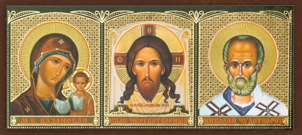 Автоикона "Казанская БМ, Спас Нерукотворный, Николай Чудотворец", зеленый, 4,5х10 на МДФ