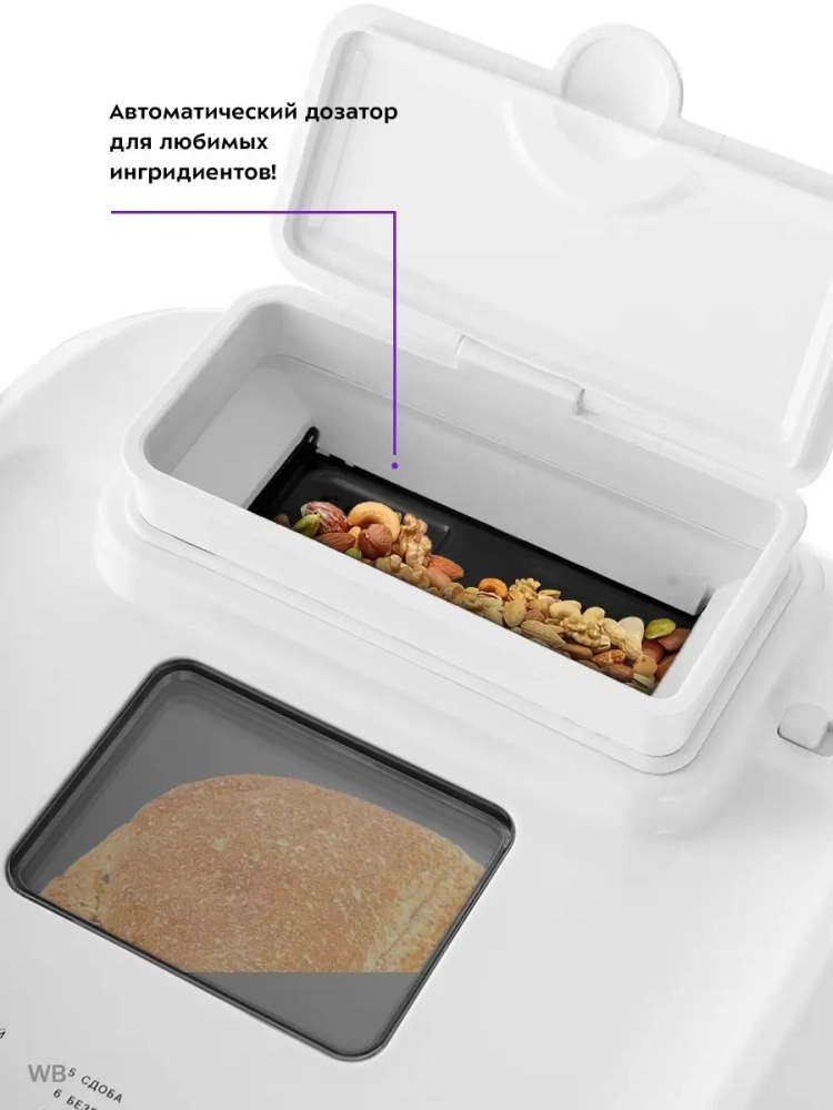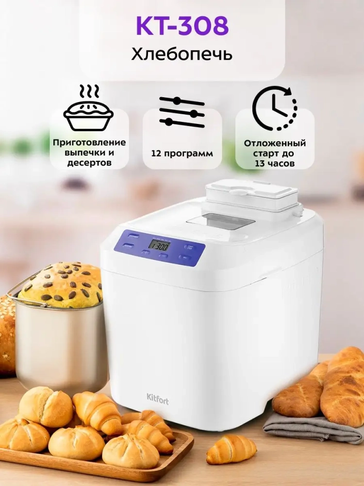 Хлебопечь Kitfort КТ-308 – это идеальное решение для любителей домашней выпечки. С помощью этой хлебопечки вы сможете приготовить разнообразные виды хлеба, включая ржаной и сдобу, а также джемы и десерты. Хлебопечка оснащена 12 автоматическими программами, которые позволяют легко замесить из муки тесто на пироги или пиццу. Автоматический дозатор в крышке добавляет ингредиенты в нужный момент приготовления, что делает процесс ещё более удобным. Корпус хлебопечи выполнен из прочного пластика, а прозрачное окно в верхней крышке позволяет наблюдать за процессом выпекания. Функция отложенного старта даёт возможность начать приготовление в удобное для вас время, а программа ускоренной выпечки позволит быстро насладиться свежим хлебом, булкой. Вы можете выбрать вес готового продукта и цвет корочки по своему вкусу. Эта модель обладает энергонезависимой памятью: при отключении электропитания настройки сохраняются на 10 минут и продолжают выполнение программы автоматически после восстановления питания. Если же питание отсутствует более 10 минут – настройки сбрасываются. Функция поддержания температуры сохраняет вашу выпечку дома тёплой до одного часа после завершения работы программы. Хлебопеч Kitfort КТ-308 не только облегчает процесс замеса теста благодаря своим формам для замеса теста автоматическая с формами, но и гарантирует превосходный результат каждый раз.