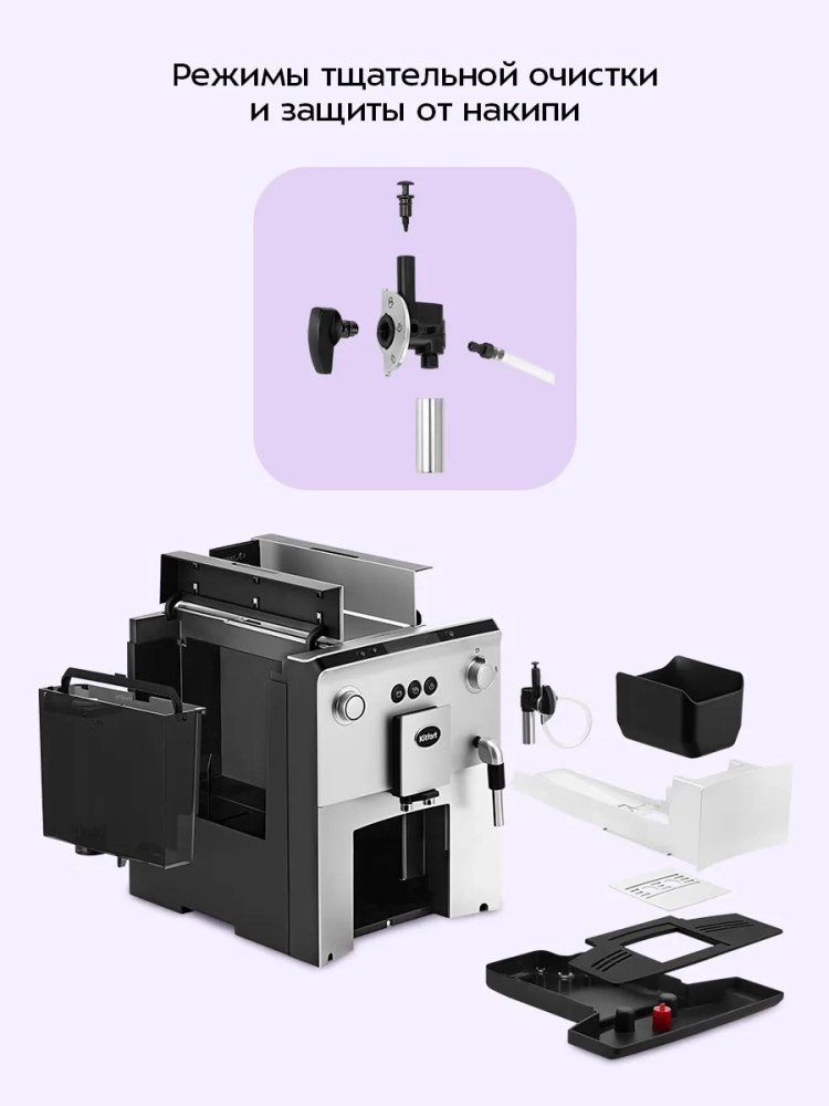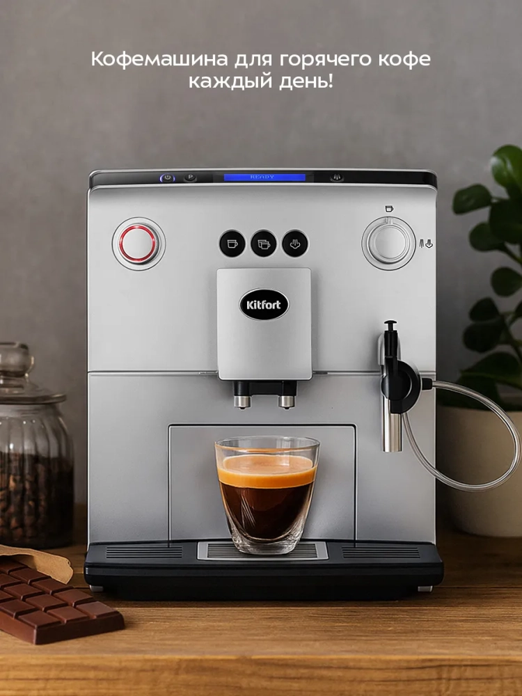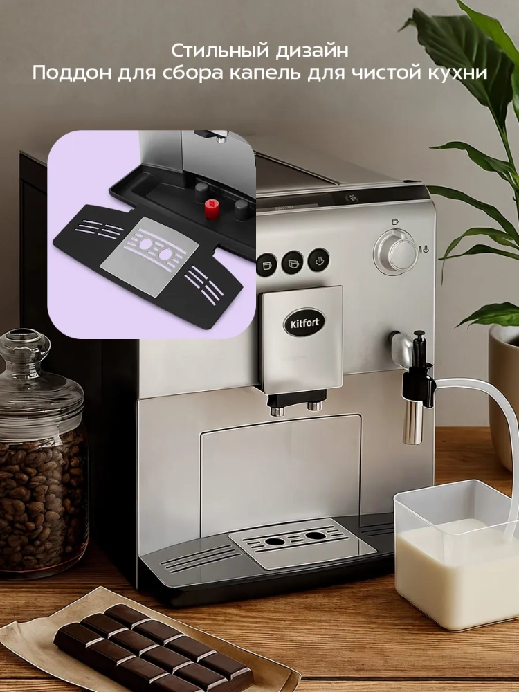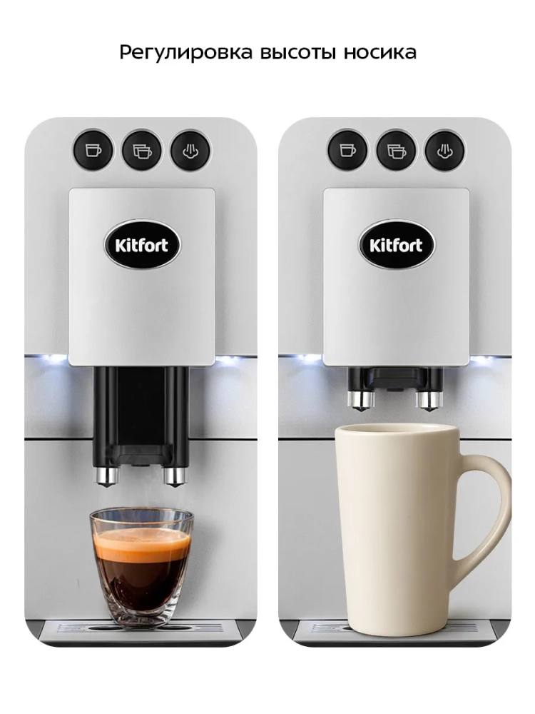 Автоматическая кофемашина Kitfort КТ-7319 — отличный выбор для гурманов, которые не желают тратить много времени и сил, чтобы насладиться полным букетом вкуса свежезаваренного кофе. Особая технология приготовления позволяет сохранить большое количество полезных веществ и тонкий аромат напитка. Кофемашина готовит эспрессо, двойной эспрессо, молочную пенку, а также горячую воду. На основе эспрессо и молока вы можете приготовить множество кофейных напитков, например, американо, капучино, латте, макиато, или флэт уайт.