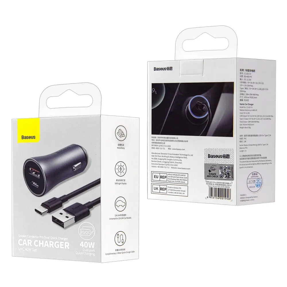 Автомобильное зарядное устройство с кабелем USB-Type-C + PD40W TZCCBJD-OG Baseus темно-серый