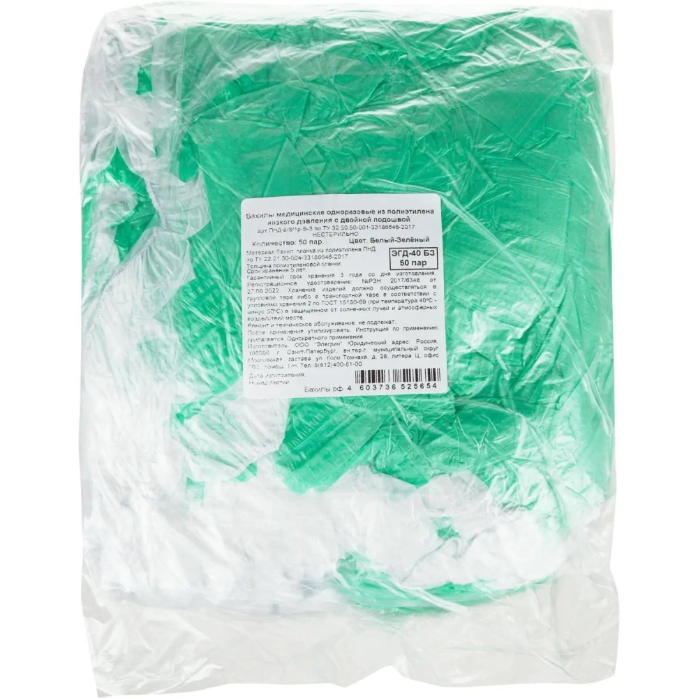 Бахилы н/с, п/э 2х слойн, 3,5г, ПНД-8/8/1р-Б-З, бело-зелен, 50пар/уп