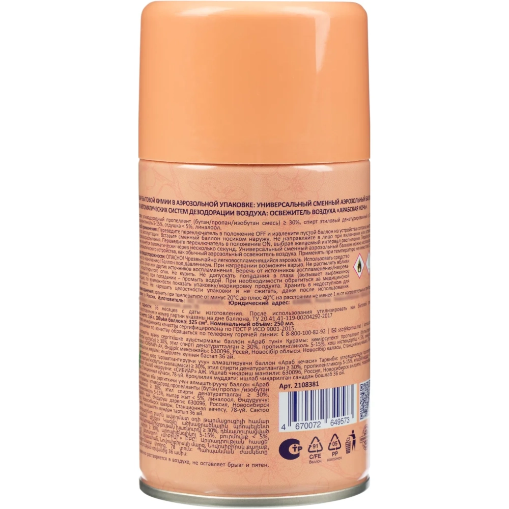 Баллон сменный для автоосвежителя Luscan 250мл Арабская ночь сух распыл