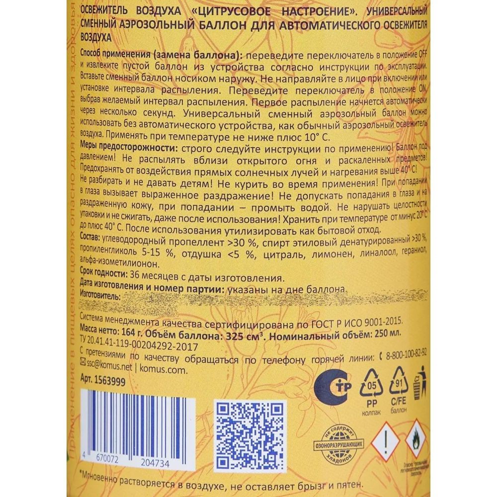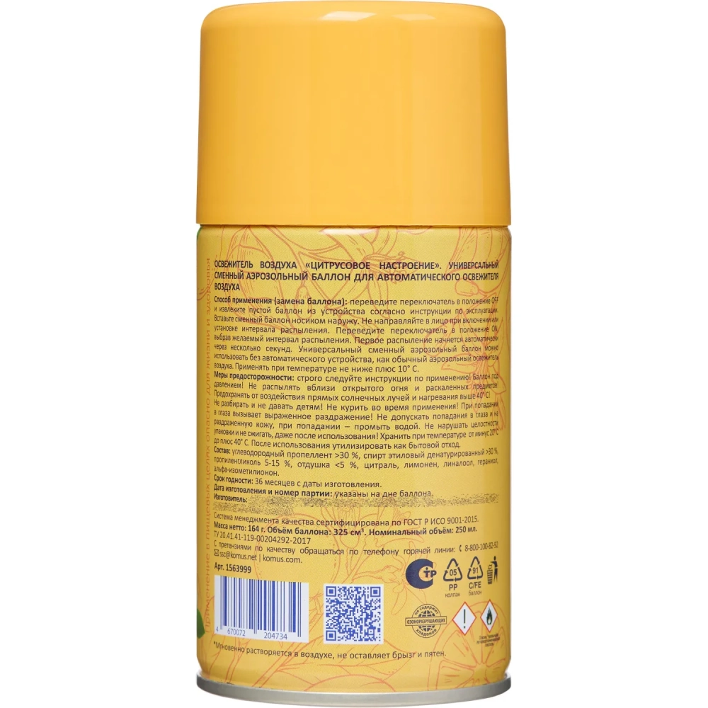 Баллон сменный для автоосвежителя Luscan 250мл Цитрусовое настр сух распыл