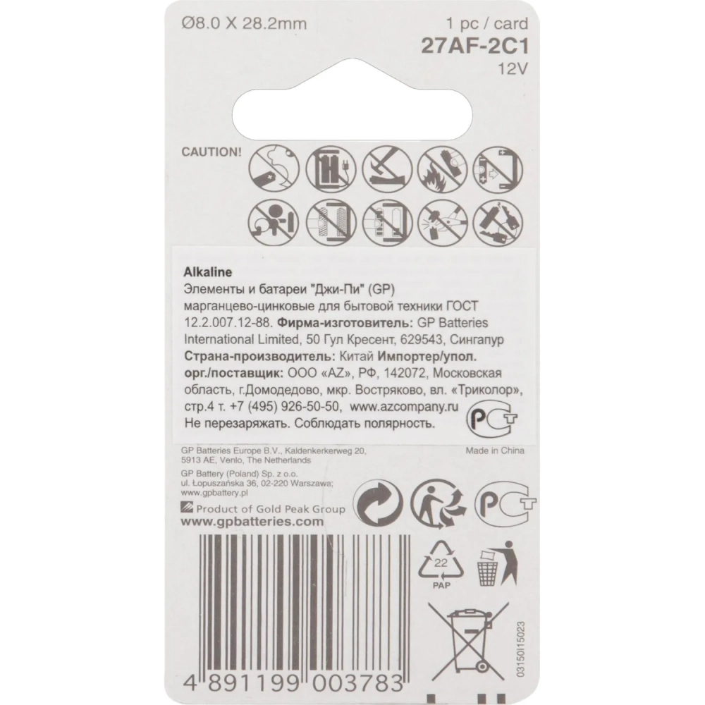 Батарейка GP 27A, 12V, алкалин., бл/1шт, 27AFRA-2C1