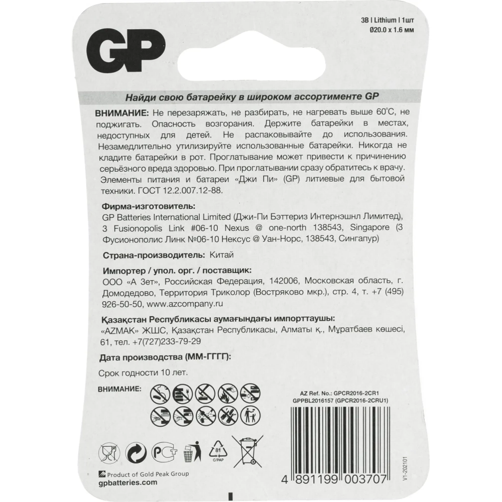 Батарейка GP CR2016, 3V, литий, бл/1шт, CR2016-7CR1/CR2016-2CRU1