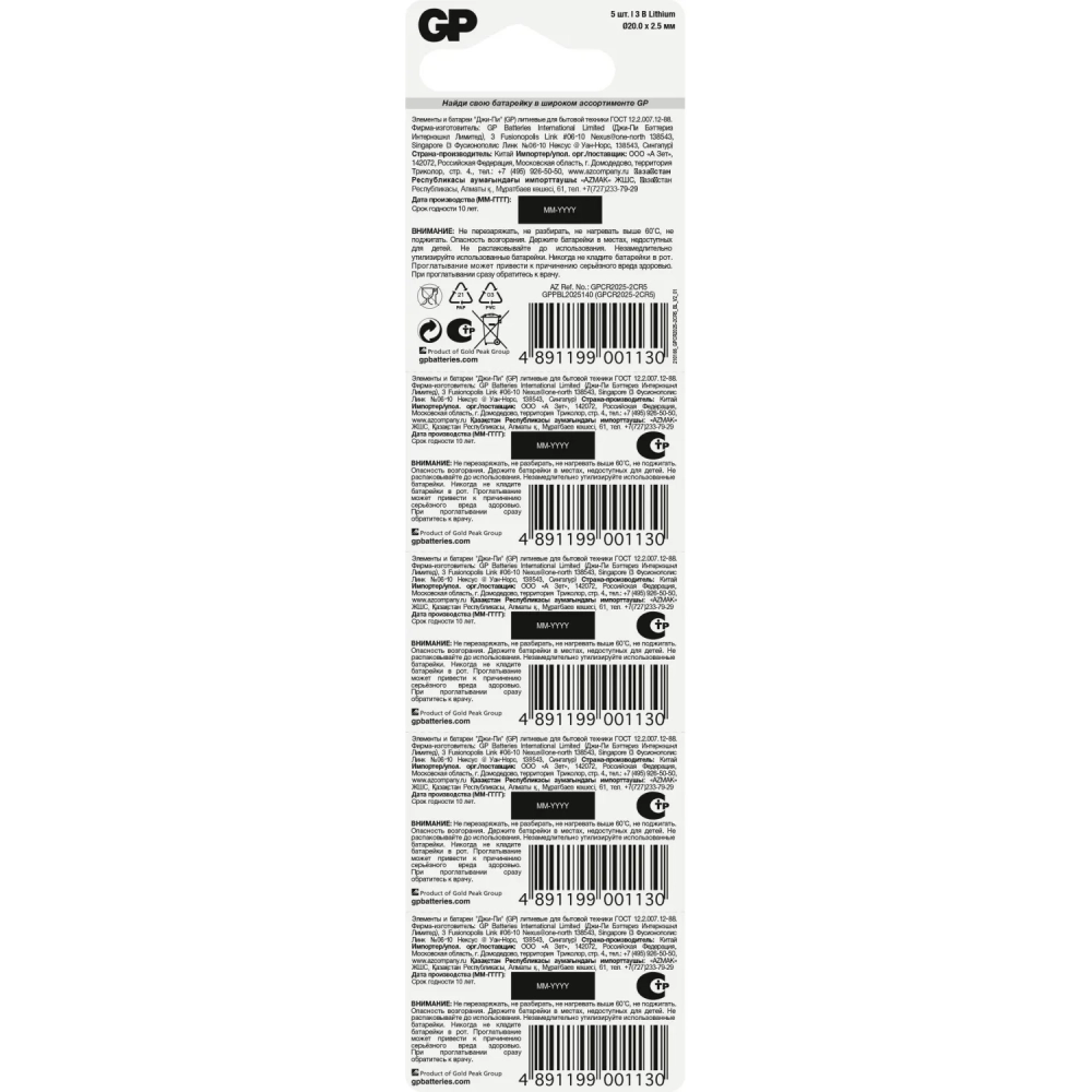 Батарейка GP CR2025, 3V, литий, бл/5шт CR2025-7CR5/CR2025-2CR5